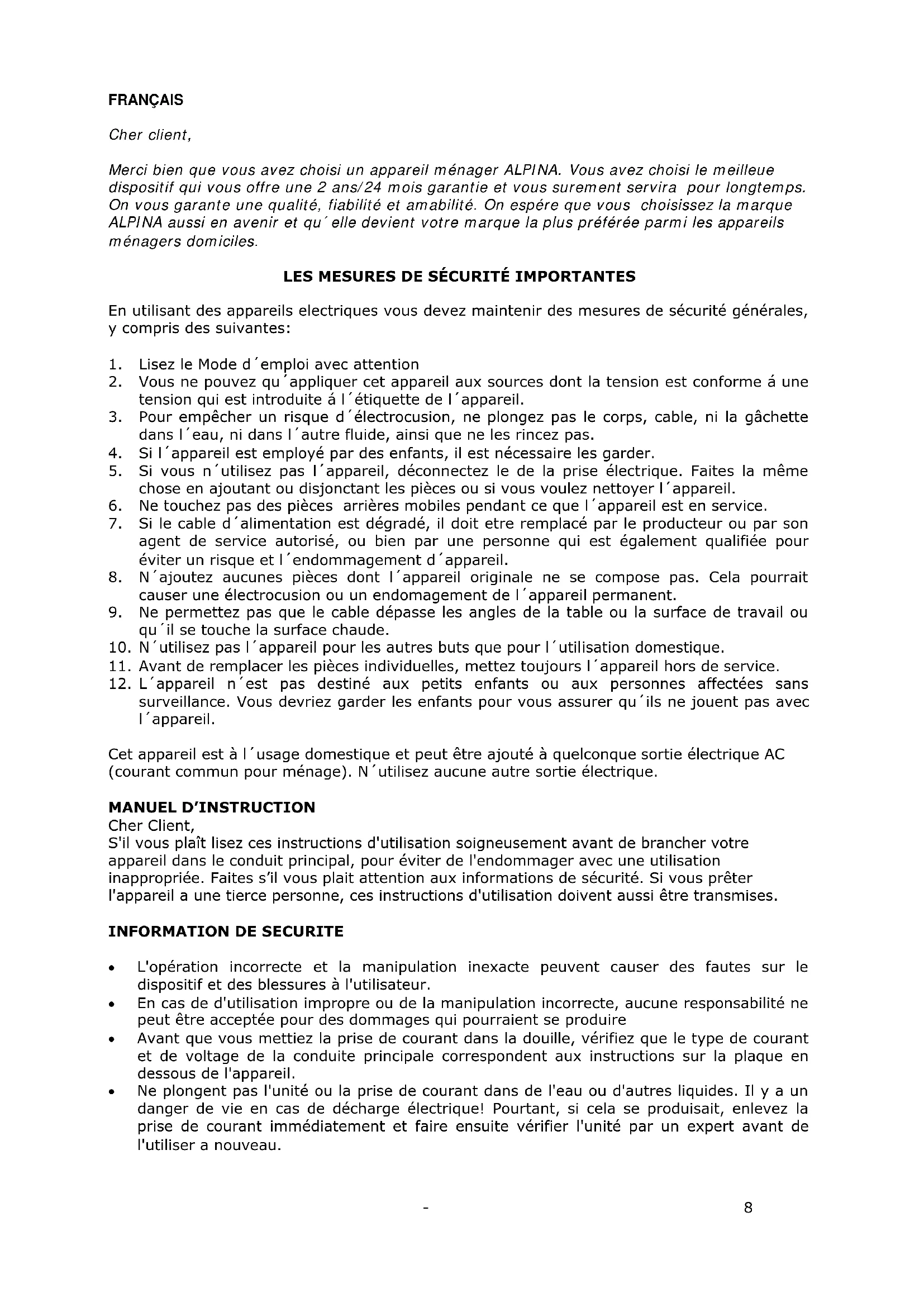 Cher client, Merci bien que vous avez choisi un appareil ménager ALPINA. Vous avez choisi le meilleue dispositif qui vous offre une 2 ans/24 mois garantie et vous surement servira pour longtemps. On vous garante une qualité, fiabilité et amabilité. On espére que vous choisissez la marque ALPINA aussi en avenir et qu´elle devient votre marque la plus préférée parmi les appareils ménagers domiciles.