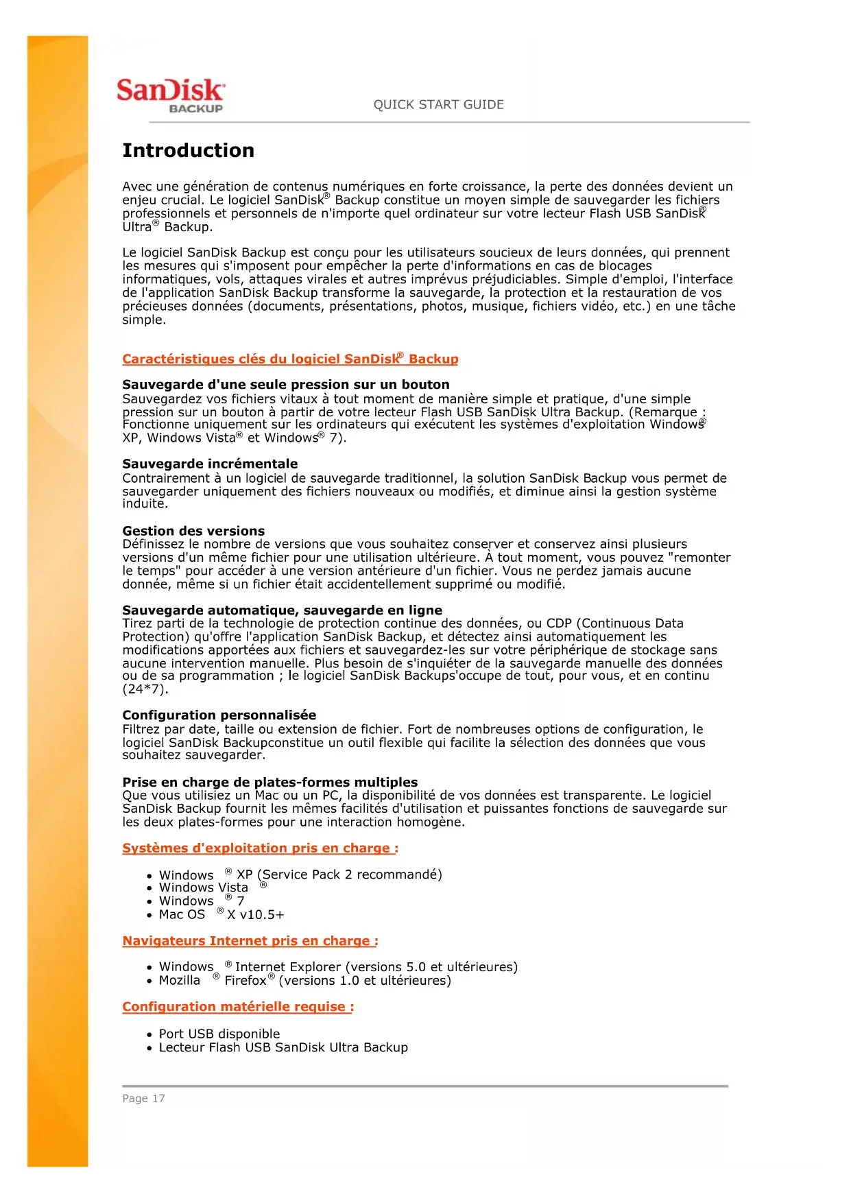 (versions 1.0 et ultérieures) Configuration matérielle requise : Port USB disponible Lecteur Flash USB SanDisk Ultra BackupQUICK START GUIDE