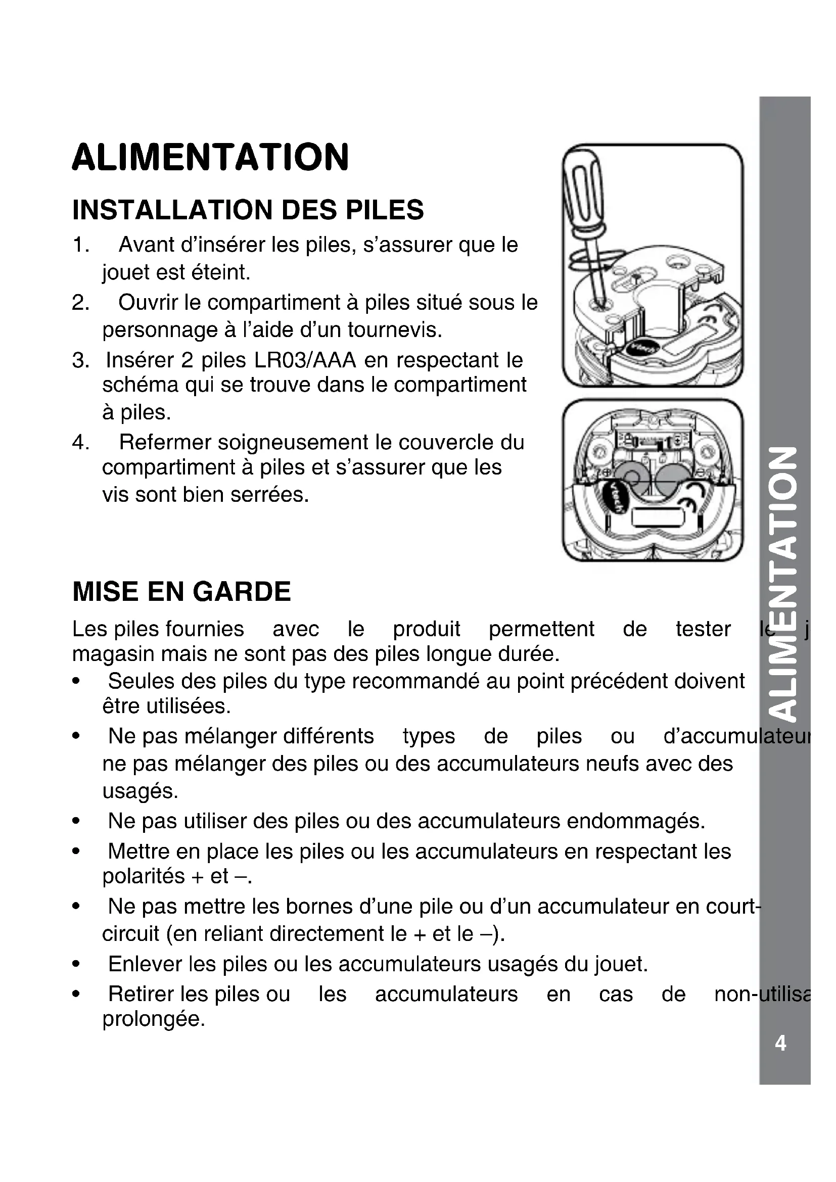 vousrecommandederetireretdejetervospilesusagéesdansles containersprévusàceteffet,puisdedéposerlejouetenndevie dans les points de collecte mis à disposition dans les magasins ou dansvotrecommune. - Lesymboledelapoubellebarréesurlesproduitsetles pilesousurleuremballagerespectifindiquequeles équipementsélectriquesetélectroniquesainsique les pilesnedoiventpasêtrejetésdanslesdéchetsménagers carilscontiennentdessubstancespouvantêtrenéfastes àl’environnementetàlasanté. - Lorsquelessymboles Hg, Cd ou Pb sont indiqués, celasigniequelapilecontientplusdemercure(Hg), cadmium(Cd)ouplomb(Pb)quelavaleurspéciéedans laDirective2006/66/CEsurlespilesetlesaccumulateurs. - Labarre solidesouslesymboledelapoubellebarrée indiquequeleproduitaétéplacésurlemarchéaprèsle 13 août 2005. - Contribuezàlaprotectiondel’environnemententriantvosproduits et piles usagés. - Pourplusd’informationssurlacollecteetletridespilesusagées, vouspouvezvisiterlesiteInternethttp://www.corepile.fr. - Pour plus d’informations sur le tri des produits électriques et électroniques,vouspouvezcontacternotreserviceconsommateurs. ALIMENTATION6 FONCTIONNALITÉS