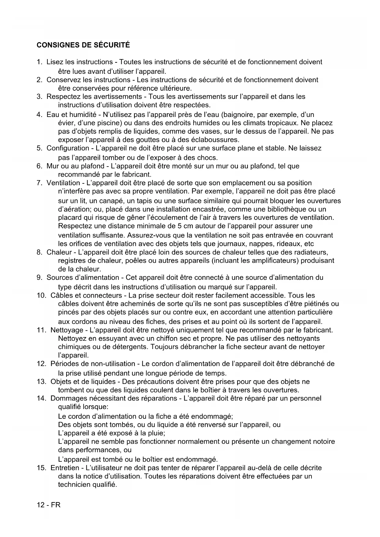 12. Périodes de non-utilisation - Le cordon d’alimentation de l’appareil doit être débranché de