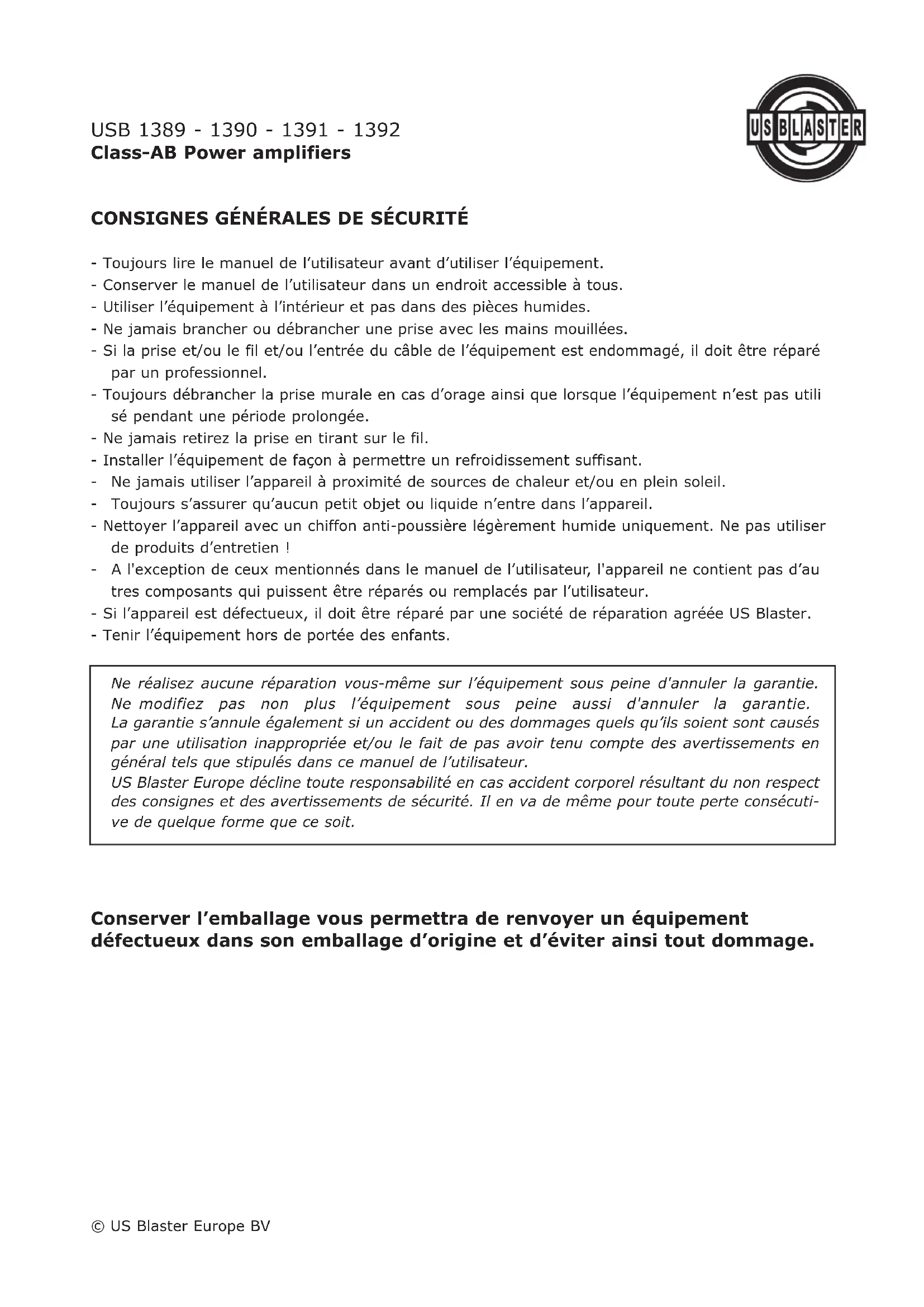 Nous vous remercions d'avoir choisi cet amplificateur US BLASTER Class AB pleine gamme pour le système audio de votre véhicule. À présent, vous possédez un amplificateur de conception intransigeante et de technique incorporant la dernière technologie de circuit avancée. Vous découvrirez bien-tôt le son optimal et la puissance fiable de cet amplificateur. Les amplificateurs US BLASTER ont opté pour un traitement artisanal avancé en utilisant les composants de plus haute qualité et sont soumis à un strict contrôle de qualité. Pour profiter au maximum et le plus longtemps possible de l'écoute agréable et parfaite, nous vous conseillons de le faire installer par un revendeur US BLASTER spécialisé. Ainsi, l'installation sera techniquement correcte et, en même temps, vous pourrez bénéficier d'une prolongation de la garantie d'un an (vous trouverez les détails dans le chapitre relatif à la garantie). Afin d'obtenir le maximum de cet amplificateur, veuillez lire complètement ce manuel. Si l'amplificateur est installé correctement, il vous servira de façon fiable pendant des années.