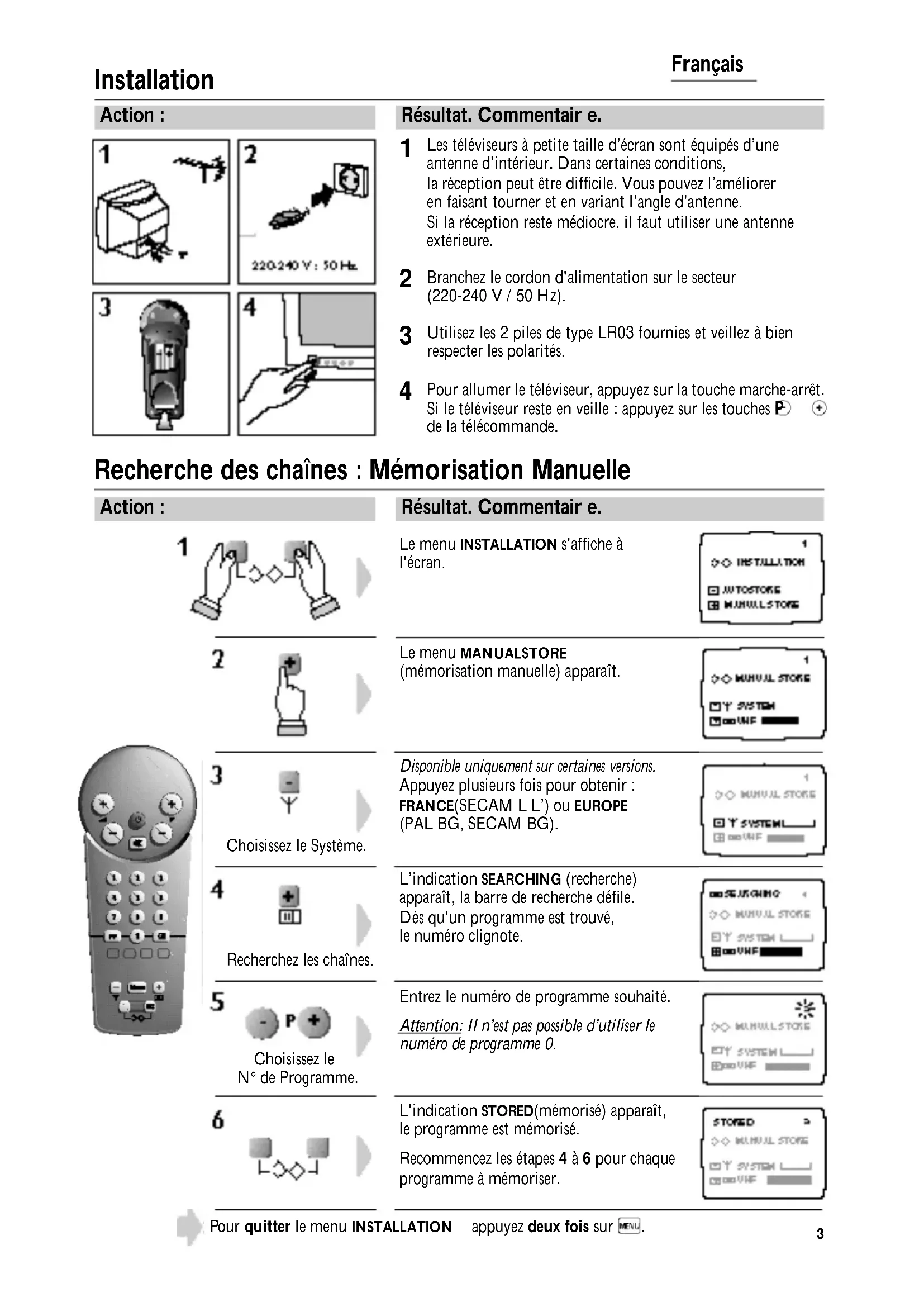 1 ◇ ◇ MANUAL STORE □ Y SYSTEM □ UNFDisponible uniquement sur certaines versions. Appuyez plusieurs fois pour obtenir : FRANCE(SECAM L L') ou EUROPE (PAL BG, SECAM BG).
