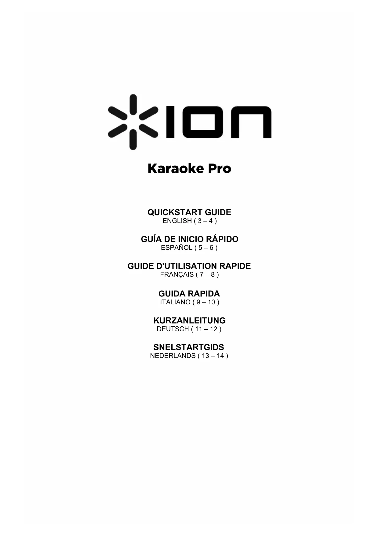 CARACTÉRISTIQUES Tension d'entrée : 9 V CC, 1,5 A polarité positive au centre Puissance d’entrée : 13,5 W Puissance de sortie : 7 W (Point) Fréquence du microphone : 174,8 MHz Type de câble inclus : Câble TRRS stéréo de 1/8 po Remarque : Vous pouvez également utiliser un câble TRS stéréo de 1/8 po avec le Karaoke Pro. Remarque : Pour des résultats optimums avec des applications iOS, utilisez un câble TRRS de 1/8 po. Type de microphone (câblé, entrée microphone de ¼ po) : N’importe quel microphone électrodynamique avec câble de ¼ po (que vous pouvez vous procurer chez un détaillant de produits électroniques ou d’instruments local). Pour acheter des câbles ou des microphones directement de ION Audio, veuillez envoyer un message à parts@ionaudio.com.9 GUIDA RAPIDA (ITALIANO) 1. Assicurarsi che tutti gli elementi elencati nel paragrafo “CONTENUTI DELLA CONFEZIONE” siano contenuti nella confezione stessa. 2. LEGGERE ATTENTAMENTE IL LIBRETTO DELLE ISTRUZIONI DI SICUREZZA PRIMA DI UTILIZZARE IL PRODOTTO. 3. Collocare il prodotto in una posizione adeguata all’uso. 4. Asicurarsi che tutti i dispositivi di ingresso quali microfoni, lettori CD o lettori MP3 collegati siano spenti e che i relativi volumi siano su "zero".