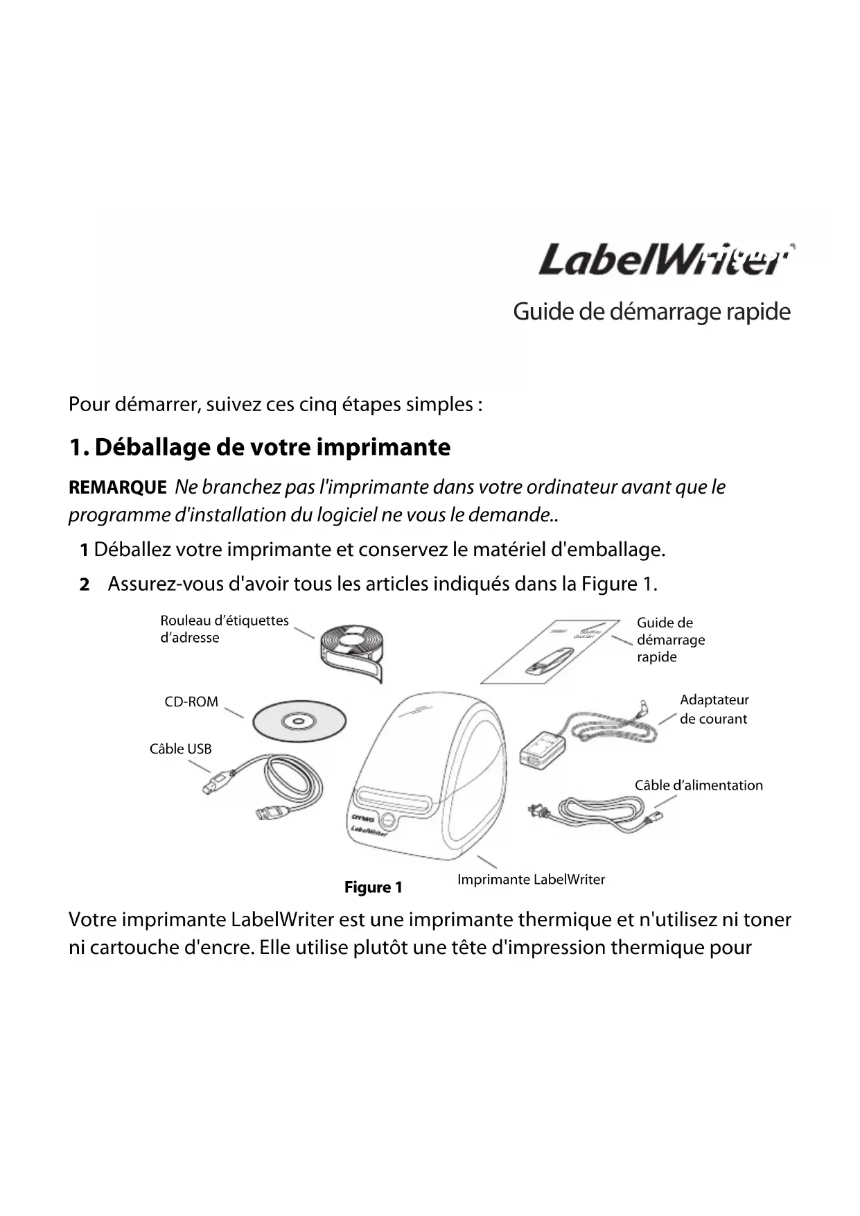 REMARQUE Ne branchez pas l'imprimante dans votre ordinateur avant que le programme d'installation du logiciel ne vous le demande.. 1 Déballez votre imprimante et conservez le matériel d'emballage. 2 Assurez-vous d'avoir tous les articles indiqués dans la Figure 1. Votre imprimante LabelWriter est une imprimante thermique et n'utilisez ni toner ni cartouche d'encre. Elle utilise plutôt une tête d'impression thermique pour