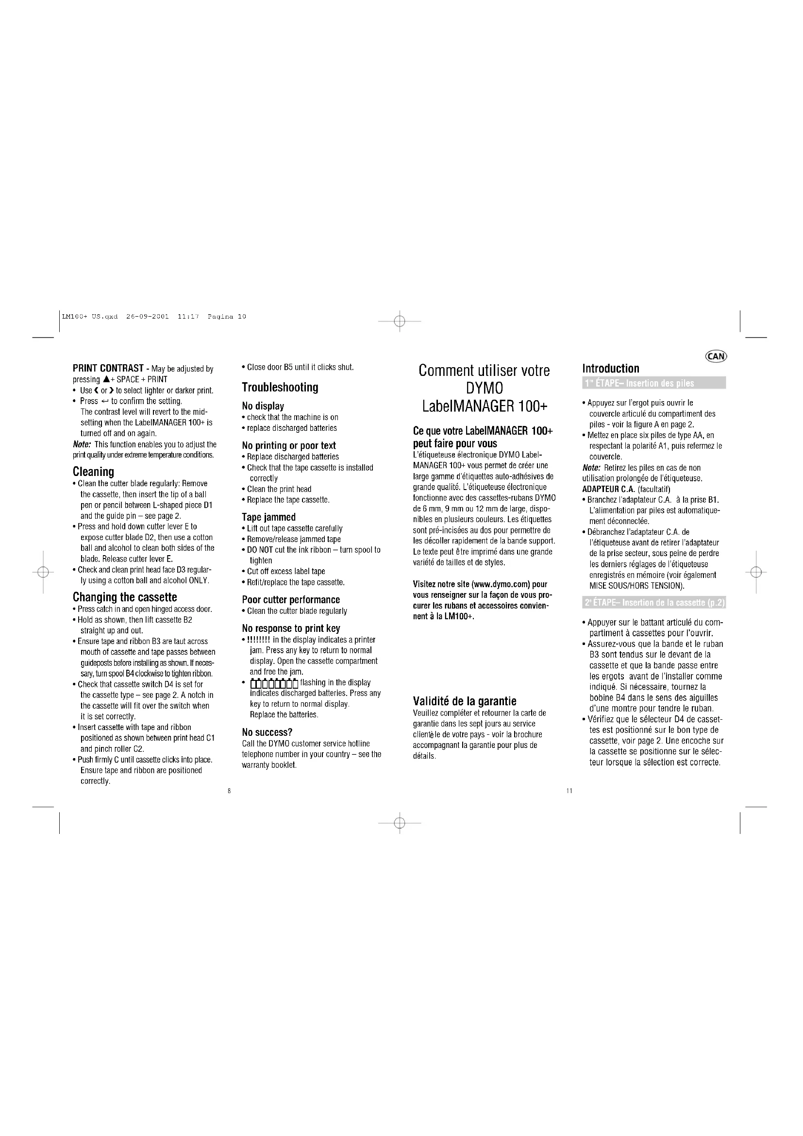 LM100+ US.qxd 26-09-2001 11:17 Pagina 8Comment utiliser votre DYMO LabelMANAGER 100+ Ce que votre LabelMANAGER 100+ peut faire pour vous L’étiqueteuse électronique DYMO Label- MANAGER 100+ vous permet de créer une large gamme d’étiquettes auto-adhésives de grande qualité. L’étiqueteuse électronique fonctionne avec des cassettes-rubans DYMO de 6 mm, 9 mm ou 12 mm de large, dispo- nibles en plusieurs couleurs. Les étiquettes sont pré-incisées au dos pour permettre de les décoller rapidement de la bande support. Le texte peut