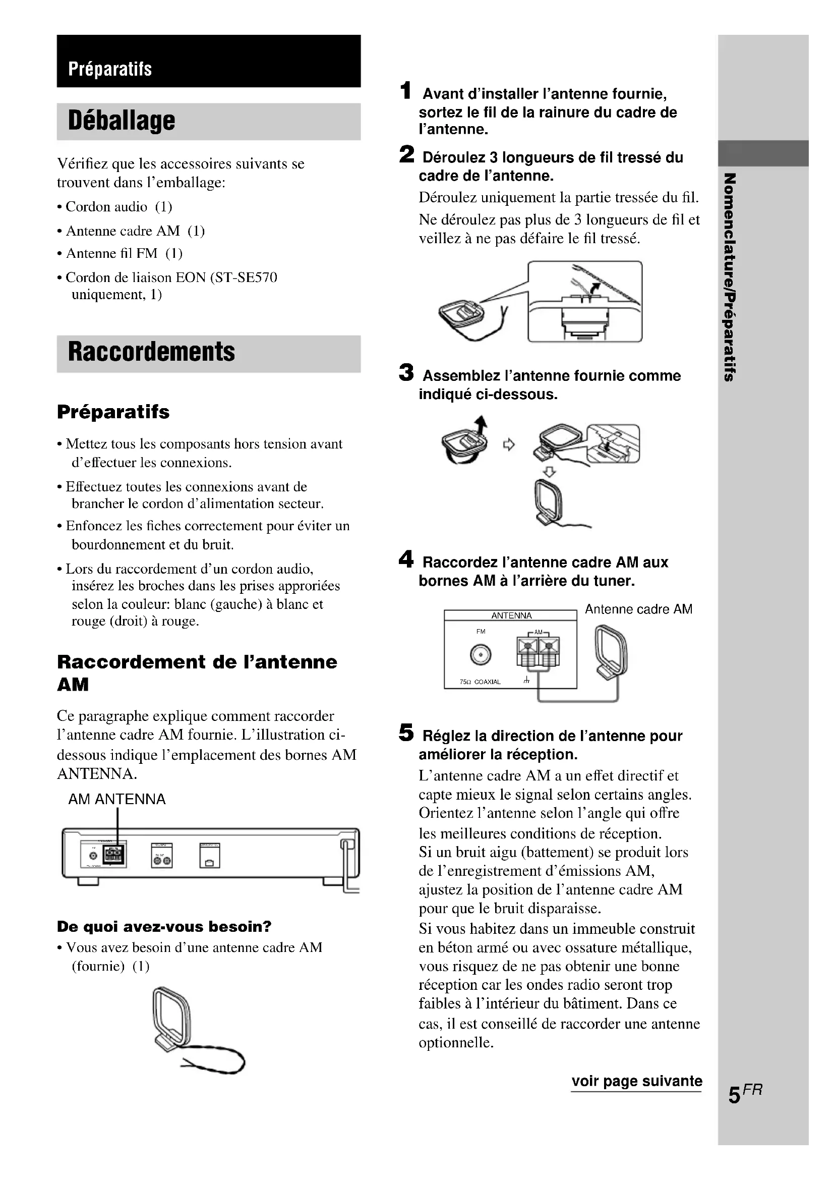 - Cordon audio (1)• Antenne cadre AM (1)• Antenne fil FM (1)• Cordon de liaison EON (ST-SE570uniquement, 1) Raccordements Préparatifs