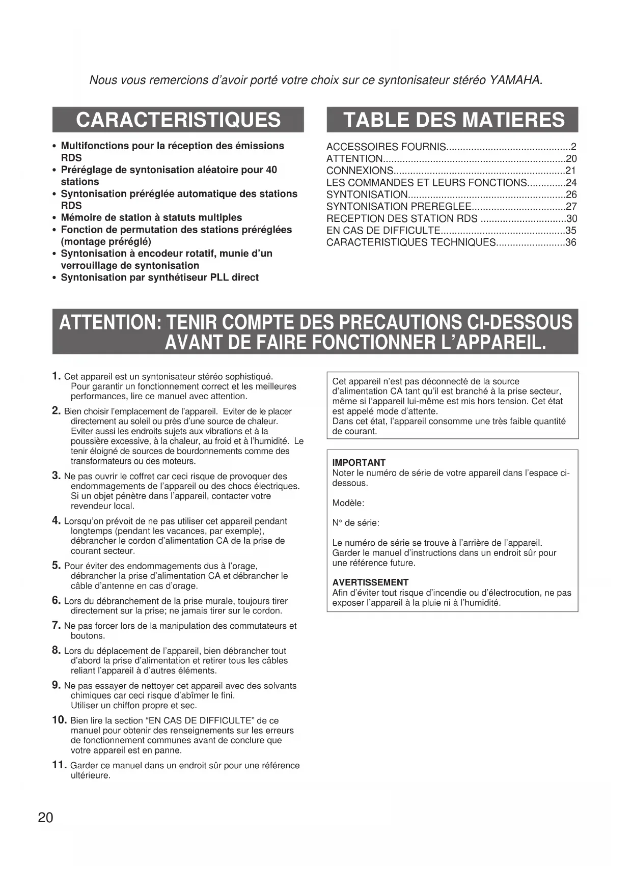 - Specifications subject to change without notice.20 Nous vous remercions d’avoir porté votre choix sur ce syntonisateur stéréo YAMAHA. CARACTERISTIQUES