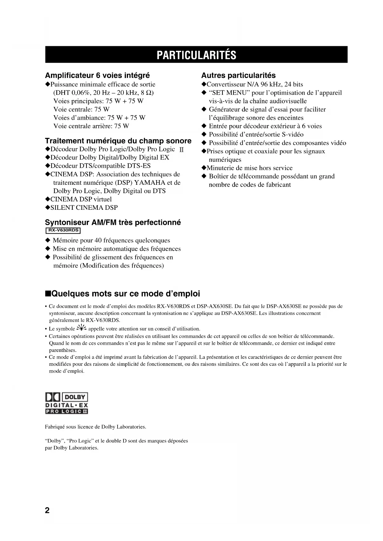 - Ce document est le mode d’emploi des modèles RX-V630RDS et DSP-AX630SE. Du fait que le DSP-AX630SE ne possède pas de syntoniseur, aucune description concernant la syntonisation ne s’applique au DSP-AX630SE. Les illustrations concernent généralement le RX-V630RDS.