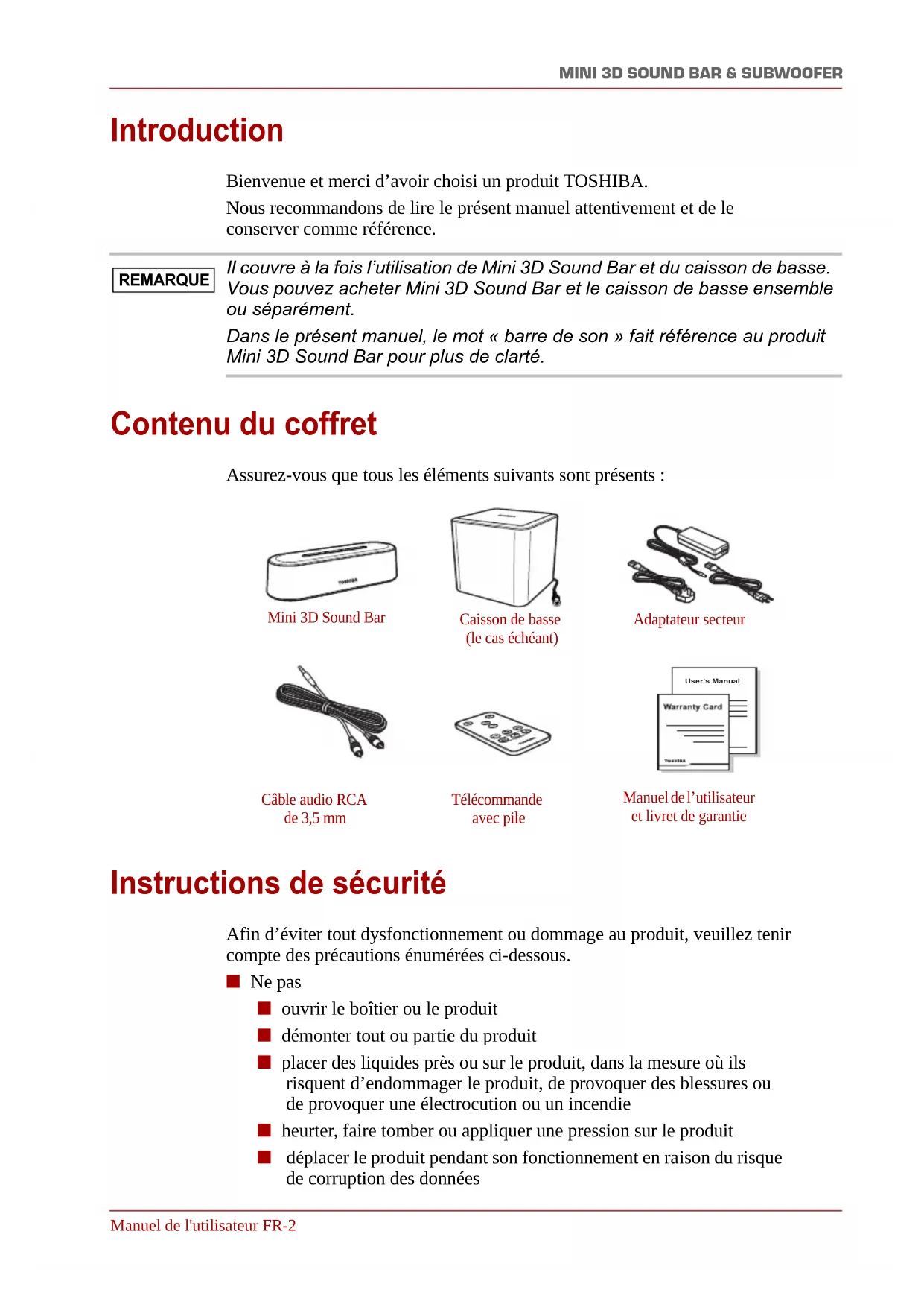 Introduction Bienvenue et merci d’avoir choisi un produit TOSHIBA. Nous recommandons de lire le présent manuel attentivement et de le conserver comme référence. Contenu du coffret Assurez-vous que tous les éléments suivants sont présents : Instructions de sécurité Afin d’éviter tout dysfonctionnement ou dommage au produit, veuillez tenir compte des précautions énumérées ci-dessous. ■ Ne pas ■ ouvrir le boîtier ou le produit ■ démonter tout ou partie du produit ■ placer des liquides près ou sur le produit, dans la mesure où ils risquent d’endommager le produit, de provoquer des blessures ou de provoquer une électrocution ou un incendie ■ heurter, faire tomber ou appliquer une pression sur le produit ■ déplacer le produit pendant son fonctionnement en raison du risque de corruption des données Il couvre à la fois l’utilisation de Mini 3D Sound Bar et du caisson de basse. Vous pouvez acheter Mini 3D Sound Bar et le caisson de basse ensemble ou séparément. Dans le présent manuel, le mot « barre de son » fait référence au produit Mini 3D Sound Bar pour plus de clarté. REMARQUE User’s Manual Mini 3D Sound Bar Caisson de basse (le cas échéant) Adaptateur secteur Câble audio RCA de 3,5 mm Télécommande avec pile Manuel de l’utilisateur et livret de garantieFR-3 Manuel de l'utilisateur