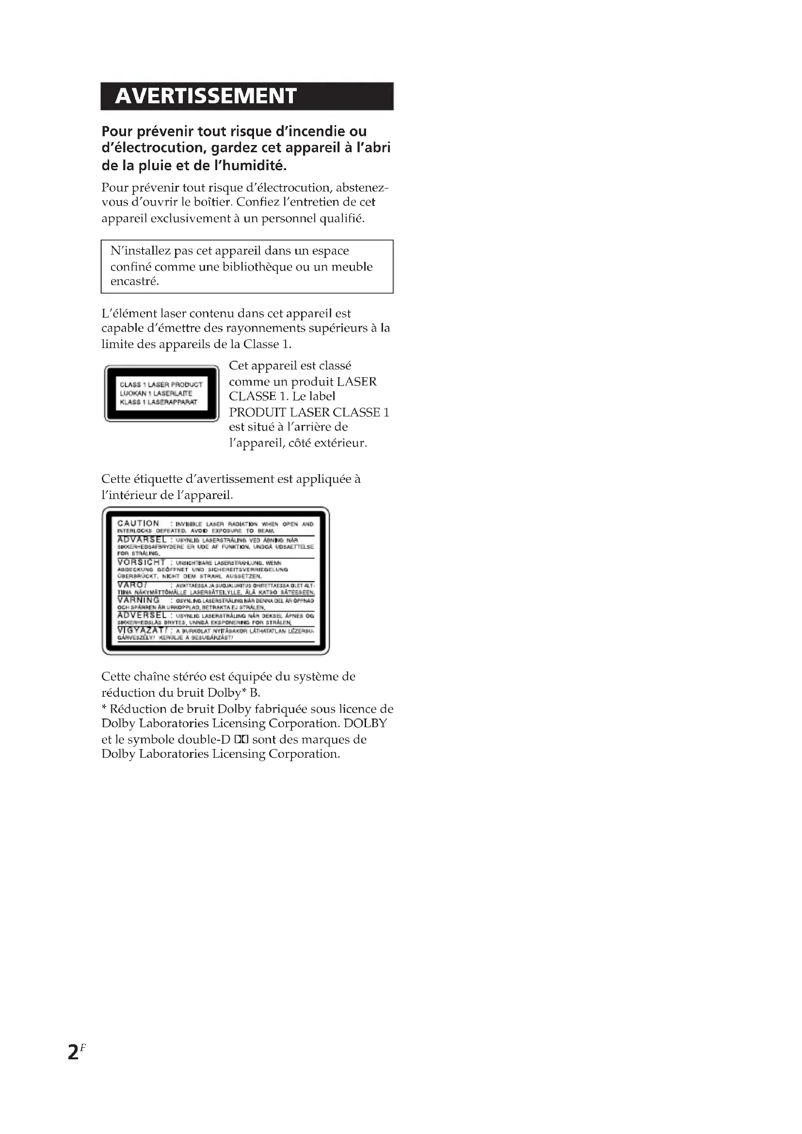 CAUTION : INVISIBLE LASER RADIATION WHEN OPEN AND INTERLOCKS DEFEATED. AVOID EXPOSURE TO BEAM. ADVERSEL : USYNLIG LASERSTRALING VED ÄBNING NÁR SIKKERHEDSAFRYDERE EN UDE AF FUNKTION. UNDÁ ÜDSAETTELSE FOR STRÅLEN. VORSICHT : UNSICHTBARE LASERSTRALUNG, WENN ABGECKUNG GEÖFFNET UND SICHEREITSVERNIEGELUNG ÜBERBRÜCKT, NICKY DEM STRAHL AUSETZEN. VARO? : AVATTASSA JA SUOJALUNTUS DHETTAESSA OLET ALT- TINA NÁKYMÄTTÖMÄLE LASERSÄTELYLLE, ÁLÁ KATSO SÄTEESEEN. VARNING : OSYNLIG LASERSTRALING NÁR DENNA OLL ÁR ÖPPNAD OCCH SPARREN AR URKOPPLAD, BETRAKTA EL STRÅLEN. ADVERSEL : USYNLIG LASERSTRALING NÁR DEKSEL ÁPNES OG SIKKERHEDSLAS BRYTES, UNDÁ EKSPONERING FOR STRÅLEN. VIGYAZAT? : A BURKOLAT NYTÄSAKOR LÄTHATATLAN LÉZERSU- GÄRVESZÉLY? KENÜLJE A BESUGÄNZÄST?Cette chaîne stéréo est équipée du système de réduction du bruit Dolby* B.