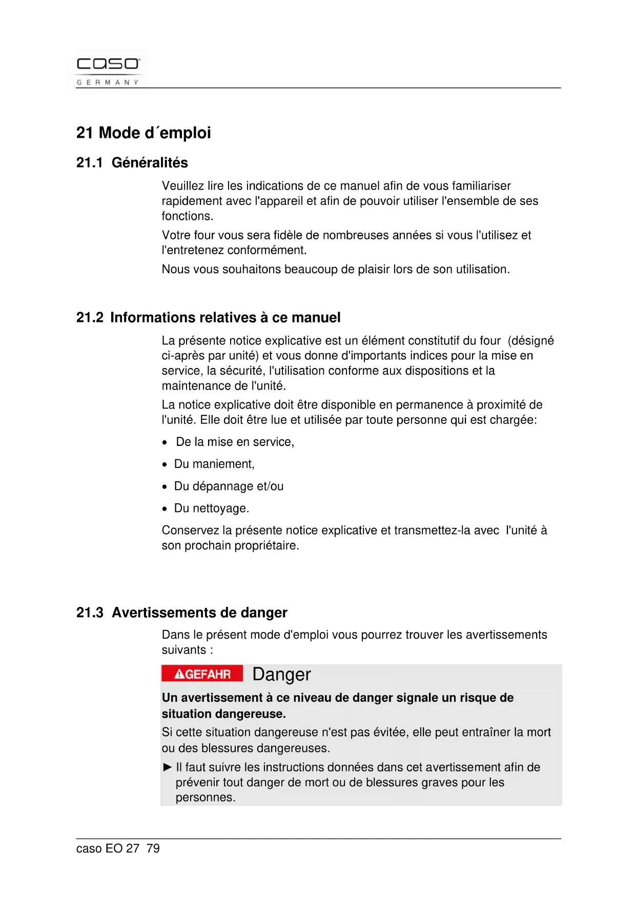 Dans le présent mode d'emploi vous pourrez trouver les avertissements suivants : Danger Un avertissement à ce niveau de danger signale un risque de situation dangereuse. Si cette situation dangereuse n'est pas évitée, elle peut entraîner la mort ou des blessures dangereuses. ► Il faut suivre les instructions données dans cet avertissement afin de prévenir tout danger de mort ou de blessures graves pour les personnes.caso EO 27 80 Attention Ce niveau de risque indique la présence possible d'une situation de danger. Si cette situation dangereuse n'est pas évitée, elle peut entraîner des blessures graves. ► Il faut suivre les instructions données dans cet avertissement afin de prévenir tout danger de blessures graves. Prudence Ce niveau de risque indique la présence possible d'une situation de danger. Si cette situation dangereuse n'est pas évitée, elle peut entraîner des blessures légères ou superficielles. ► Il faut suivre les instructions données dans cet avertissement afin de prévenir les blessures de personnes. Remarque Cette indication est accompagnée d'informations complémentaires pour faciliter l'utilisation de l'appareil.