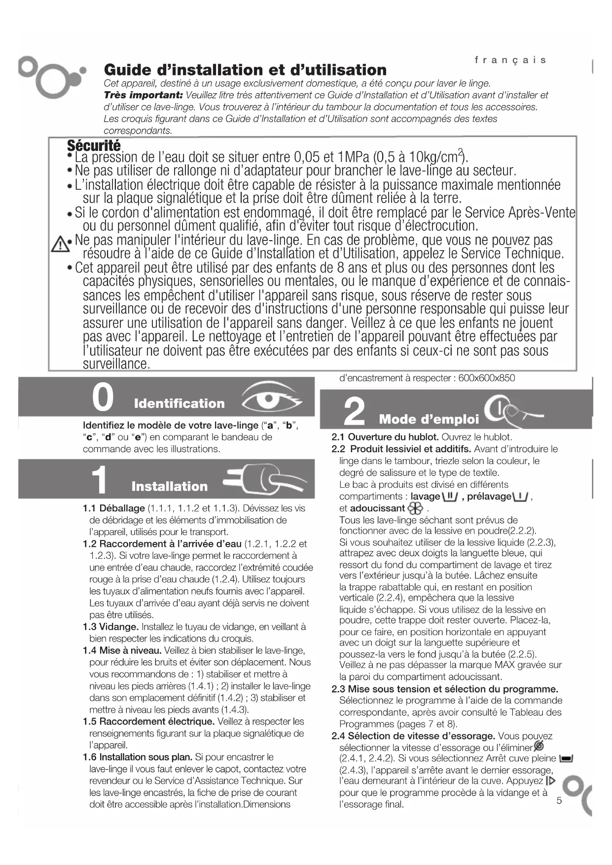 Ne pas utiliser de rallonge ni d’adaptateur pour brancher le lave-linge au secteur. L’installation électrique doit être capable de résister à la puissance maximale mentionnée sur la plaque signalétique et la prise doit être dûment reliée à la terre. Si le cordon d'alimentation est endommagé, il doit être remplacé par le Service Après-Vente ou du personnel dûment qualifié, afin d'éviter tout risque d’électrocution. Ne pas manipuler l'intérieur du lave-linge. En cas de problème, que vous ne pouvez pas résoudre à l’aide de ce Guide d’Installation et d’Utilisation, appelez le Service Technique. Cet appareil peut être utilisé par des enfants de 8 ans et plus ou des personnes dont les capacités physiques, sensorielles ou mentales, ou le manque d’expérience et de connais- sances les empêchent d'utiliser l'appareil sans risque, sous réserve de rester sous surveillance ou de recevoir des d'instructions d'une personne responsable qui puisse leur assurer une utilisation de l'appareil sans danger. Veillez à ce que les enfants ne jouent pas avec l'appareil. Le nettoyage et l’entretien de l’appareil pouvant être effectuées par l’utilisateur ne doivent pas être exécutées par des enfants si ceux-ci ne sont pas sous surveillance. Identifiez le modèle de votre lave-linge (“a”, “b”, “c”, “d” ou “e”) en comparant le bandeau de commande avec les illustrations.1.1 Déballage (1.1.1, 1.1.2 et 1.1.3). Dévissez les vis de débridage et les éléments d’immobilisation de l’appareil, utilisés pour le transport.1.2 Raccordement à l’arrivée d’eau (1.2.1, 1.2.2 et 1.2.3). Si votre lave-linge permet le raccordement à une entrée d’eau chaude, raccordez l’extrémité coudée rouge à la prise d’eau chaude (1.2.4). Utilisez toujours les tuyaux d’alimentation neufs fournis avec l’appareil. Les tuyaux d’arrivée d’eau ayant déjà servis ne doivent pas être utilisés.1.3 Vidange. Installez le tuyau de vidange, en veillant à bien respecter les indications du croquis.1.4 Mise à niveau. Veillez à bien stabiliser le lave-linge, pour réduire les bruits et éviter son déplacement. Nous vous recommandons de : 1) stabiliser et mettre à niveau les pieds arrières (1.4.1) ; 2) installer le lave-linge dans son emplacement définitif (1.4.2) ; 3) stabiliser et mettre à niveau les pieds avants (1.4.3).1.5 Raccordement électrique. Veillez à respecter les renseignements figurant sur la plaque signalétique de l’appareil.1.6 Installation sous plan. Si pour encastrer le lave-linge il vous faut enlever le capot, contactez votre revendeur ou le Service d’Assistance Technique. Sur les lave-linge encastrés, la fiche de prise de courant doit être accessible après l’installation.Dimensions d’encastrement à respecter : 600x600x850 2.1 Ouverture du hublot. Ouvrez le hublot.