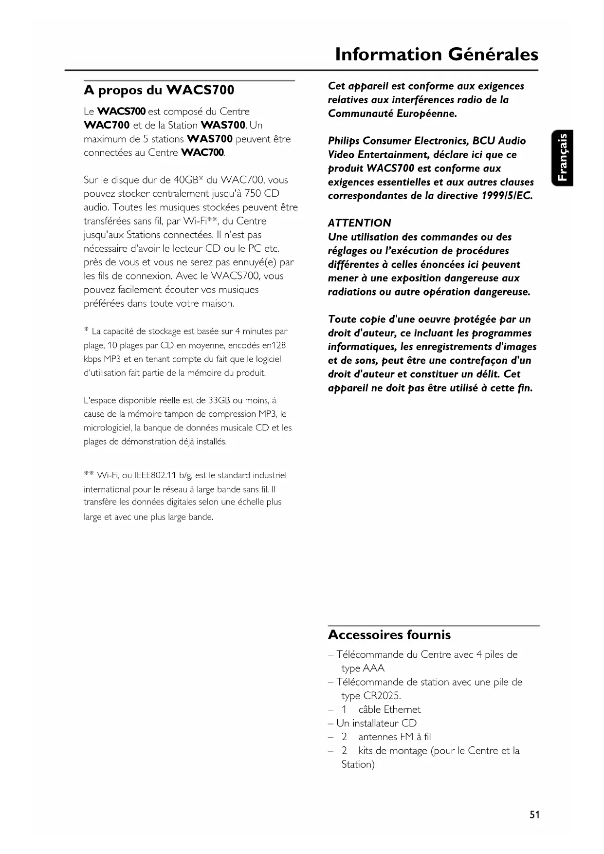 - -88 Annexe Comment installer votre Centre et votre Station aux murs -90 Sommaire p049-p90_WACS700_FreNEW2 9/16/2005, 09:555051 Français Information Générales A propos du WACS700 Le WACS700 est composé du Centre WAC700 et de la Station WAS700. Un maximum de 5 stations WAS700 peuvent être connectées au Centre WAC700. Sur le disque dur de 40GB* du WAC700, vous pouvez stocker centralement jusqu'à 750 CD audio. Toutes les musiques stockées peuvent être transférées sans fil, par Wi-Fi**, du Centre jusqu'aux Stations connectées. Il n'est pas nécessaire d'avoir le lecteur CD ou le PC etc. près de vous et vous ne serez pas ennuyé(e) par les fils de connexion. Avec le WACS700, vous pouvez facilement écouter vos musiques préférées dans toute votre maison. p. 89
