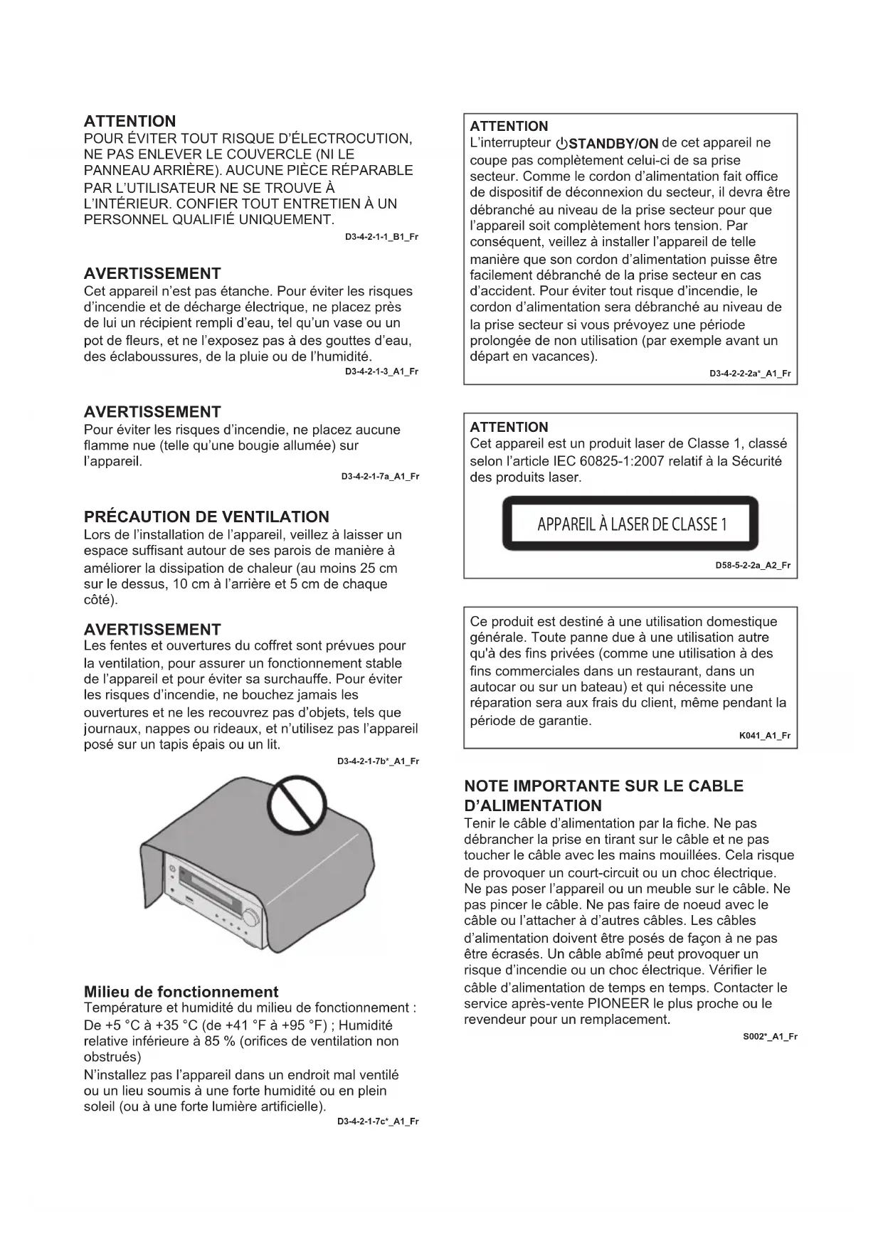 D’ALIMENTATION Tenir le câble d’alimentation par la fiche. Ne pas débrancher la prise en tirant sur le câble et ne pas toucher le câble avec les mains mouillées. Cela risque de provoquer un court-circuit ou un choc électrique. Ne pas poser l’appareil ou un meuble sur le câble. Ne pas pincer le câble. Ne pas faire de noeud avec le câble ou l’attacher à d’autres câbles. Les câbles d’alimentation doivent être posés de façon à ne pas être écrasés. Un câble abîmé peut provoquer un risque d’incendie ou un choc électrique. Vérifier le câble d’alimentation de temps en temps. Contacter le service après-vente PIONEER le plus proche ou le revendeur pour un remplacement. S002*_A1_Fr ATTENTION L’interrupteur STANDBY/ON de cet appareil ne coupe pas complètement celui-ci de sa prise secteur. Comme le cordon d’alimentation fait office de dispositif de déconnexion du secteur, il devra être débranché au niveau de la prise secteur pour que l’appareil soit complètement hors tension. Par conséquent, veillez à installer l’appareil de telle manière que son cordon d’alimentation puisse être facilement débranché de la prise secteur en cas d’accident. Pour éviter tout risque d’incendie, le cordon d’alimentation sera débranché au niveau de la prise secteur si vous prévoyez une période prolongée de non utilisation (par exemple avant un départ en vacances). D3-4-2-2-2a*_A1_Fr X-HM16_26_26D_Fr.book 2 ページ 2016年7月22日 金曜日 午後5時11分K058a_A1_Fr