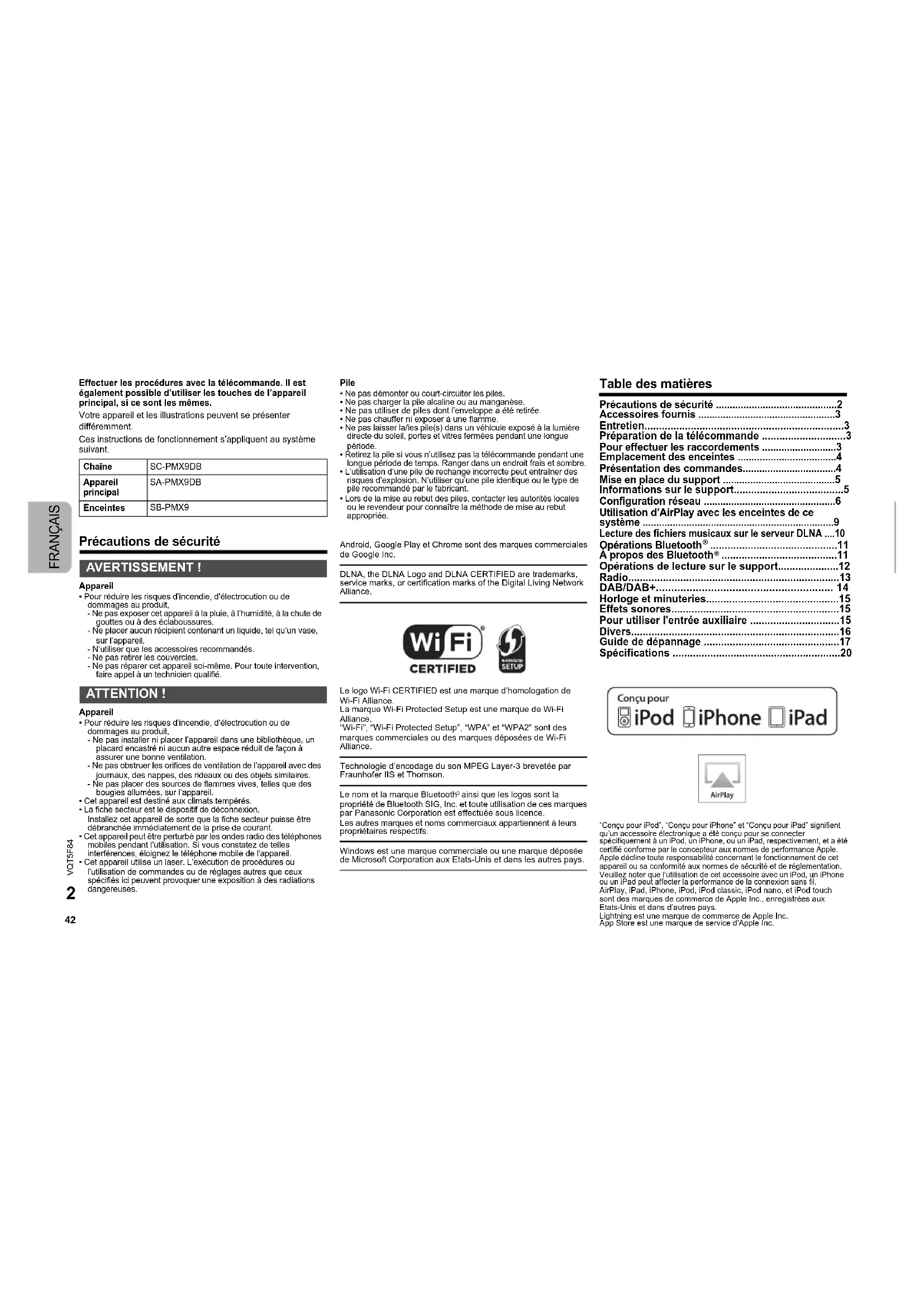 - Spécifications “Conçu pour iPod”, “Conçu pour iPhone” et “Conçu pour iPad” signifient qu’un accessoire électronique a été conçu pour se connecter spécifiquement à un iPod, un iPhone, ou un iPad, respectivement, et a été certifié conforme par le concepteur aux normes de performance Apple.Apple décline toute responsabilité concernant le fonctionnement de cet appareil ou sa conformité aux normes de sécurité et de réglementation.Veuillez noter que l’utilisation de cet accessoire avec un iPod, un iPhone ou un iPad peut affecter la performance de la connexion sans fil.AirPlay, iPad, iPhone, iPod, iPod classic, iPod nano, et iPod touch sont des marques de commerce de Apple Inc., enregistrées aux Etats-Unis et dans d’autres pays.Lightning est une marque de commerce de Apple Inc.App Store est une marque de service d'Apple Inc. Chaîne SC-PMX9DB Appareil principal SA-PMX9DB Enceintes SB-PMX9 AVERTISSEMENT ! ATTENTION ! p. 20