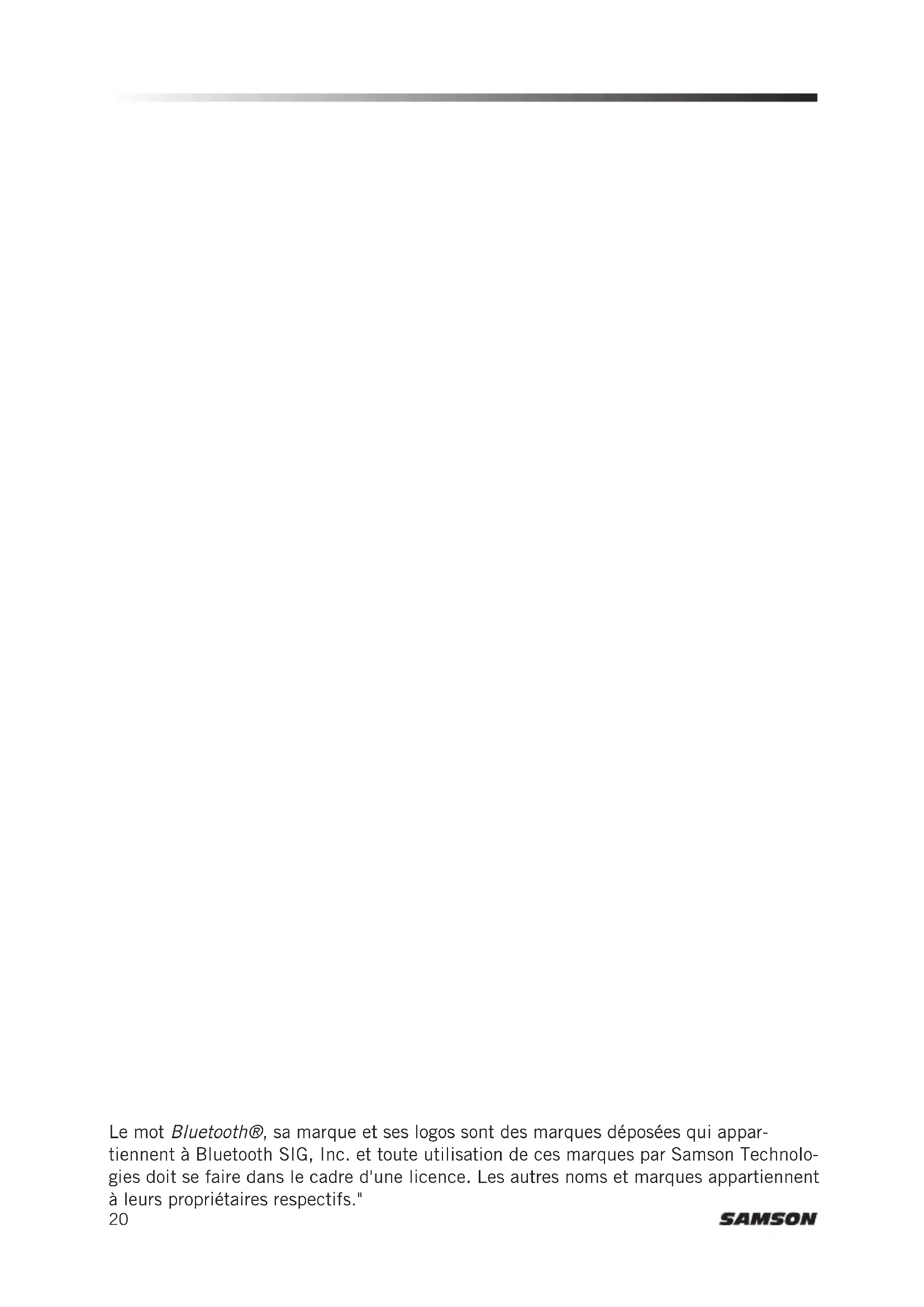 High 10kHz Shelving ±15 dB Low 100Hz Shelving ±15 dB Speech/Music Switch 167Hz, 3dB/Octave Effects 16 Preset, 24-bit DSP Indicators 5-point Level, LIMITER, PHANTOM Bluetooth® Bluetooth 3.0, A2DP Modulation Technique FHSS (GFSK, π/4-DQPSK, 8-DPSK) Dimensions and Weight Dimensions 20.1’’(L) x 10.6’’(W) x 19’’(H) 510mm(L) x 270mm(W) x 485mm(H) Weight 41.5Ib / 18.8kg At Samson, we are continually improving our products, therefore specifications and images are subject to change without notice.20 Le mot Bluetooth®, sa marque et ses logos sont des marques déposées qui appar- tiennent à Bluetooth SIG, Inc. et toute utilisation de ces marques par Samson Technolo- gies doit se faire dans le cadre d'une licence. Les autres noms et marques appartiennent à leurs propriétaires respectifs."21 XP800 • Système de sonorisation portable ENGLISH