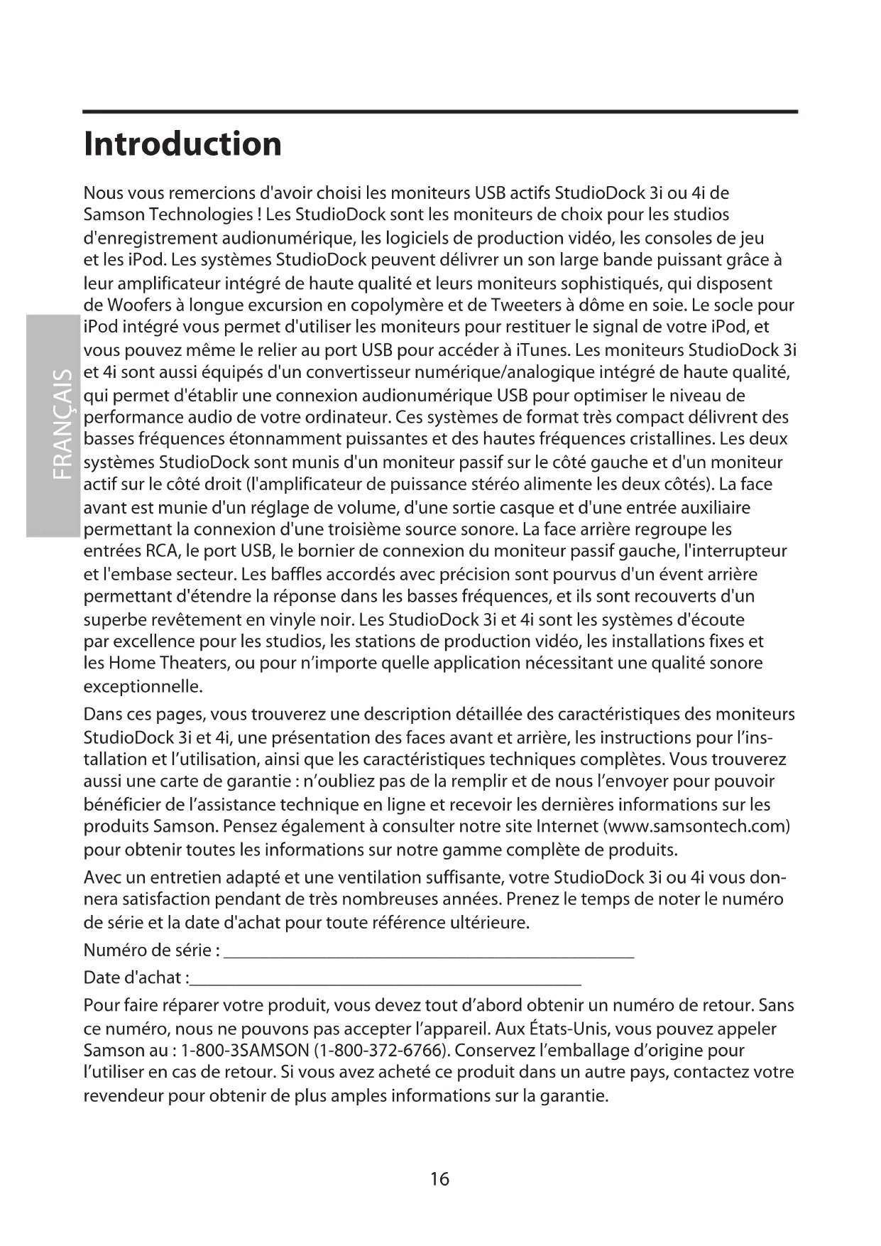 - Now adjust the SWEEP control to the desired frequency. A good place to start with the StudioDock 3i and 4i is about 70 Hz. You can also use your ears by adjusting the SWEEP control to the frequency that sounds good to you. ENGLISH15 StudioDock 3i and 4i Wiring Guide Unbalanced 1/4” to RCA Cable Un-Balanced XLR to RCA Cable StudioDock 3i and 4i Wiring Guide There are several ways to interface the StudioDock 3i and 4i, depending on your exact monitoring set-up. Follow the cable diagrams below for connecting your monitor sys- tem. RCA to RCA Cable ENGLISH16 Introduction Nous vous remercions d'avoir choisi les moniteurs USB actifs StudioDock 3i ou 4i de Samson Technologies ! Les StudioDock sont les moniteurs de choix pour les studios d'enregistrement audionumérique, les logiciels de production vidéo, les consoles de jeu et les iPod. Les systèmes StudioDock peuvent délivrer un son large bande puissant grâce à leur amplificateur intégré de haute qualité et leurs moniteurs sophistiqués, qui disposent de Woofers à longue excursion en copolymère et de Tweeters à dôme en soie. Le socle pour iPod intégré vous permet d'utiliser les moniteurs pour restituer le signal de votre iPod, et vous pouvez même le relier au port USB pour accéder à iTunes. Les moniteurs StudioDock 3i et 4i sont aussi équipés d'un convertisseur numérique/analogique intégré de haute qualité, qui permet d'établir une connexion audionumérique USB pour optimiser le niveau de performance audio de votre ordinateur. Ces systèmes de format très compact délivrent des basses fréquences étonnamment puissantes et des hautes fréquences cristallines. Les deux systèmes StudioDock sont munis d'un moniteur passif sur le côté gauche et d'un moniteur actif sur le côté droit (l'amplificateur de puissance stéréo alimente les deux côtés). La face avant est munie d'un réglage de volume, d'une sortie casque et d'une entrée auxiliaire permettant la connexion d'une troisième source sonore. La face arrière regroupe les entrées RCA, le port USB, le bornier de connexion du moniteur passif gauche, l'interrupteur et l'embase secteur. Les baffles accordés avec précision sont pourvus d'un évent arrière permettant d'étendre la réponse dans les basses fréquences, et ils sont recouverts d'un superbe revêtement en vinyle noir. Les StudioDock 3i et 4i sont les systèmes d'écoute par excellence pour les studios, les stations de production vidéo, les installations fixes et les Home Theaters, ou pour n’importe quelle application nécessitant une qualité sonore exceptionnelle. Dans ces pages, vous trouverez une description détaillée des caractéristiques des moniteurs StudioDock 3i et 4i, une présentation des faces avant et arrière, les instructions pour l’ins- tallation et l’utilisation, ainsi que les caractéristiques techniques complètes. Vous trouverez aussi une carte de garantie : n’oubliez pas de la remplir et de nous l’envoyer pour pouvoir bénéficier de l’assistance technique en ligne et recevoir les dernières informations sur les produits Samson. Pensez également à consulter notre site Internet (www.samsontech.com) pour obtenir toutes les informations sur notre gamme complète de produits. Avec un entretien adapté et une ventilation suffisante, votre StudioDock 3i ou 4i vous don- nera satisfaction pendant de très nombreuses années. Prenez le temps de noter le numéro de série et la date d'achat pour toute référence ultérieure. Numéro de série : ____________________________________________ Date d'achat :__________________________________________ Pour faire réparer votre produit, vous devez tout d’abord obtenir un numéro de retour. Sans ce numéro, nous ne pouvons pas accepter l’appareil. Aux États-Unis, vous pouvez appeler Samson au : 1-800-3SAMSON (1-800-372-6766). Conservez l’emballage d’origine pour l’utiliser en cas de retour. Si vous avez acheté ce produit dans un autre pays, contactez votre revendeur pour obtenir de plus amples informations sur la garantie. FRANÇAIS17 StudioDock 3i et 4i - Caractéristiques Les moniteurs de studio Samson StudioDock 3i et 4i avec socle pour iPod offrent une réponse linéaire et précise tout en restant très agréables à l’écoute. Voici quelques-unes de leurs caractéristiques générales :