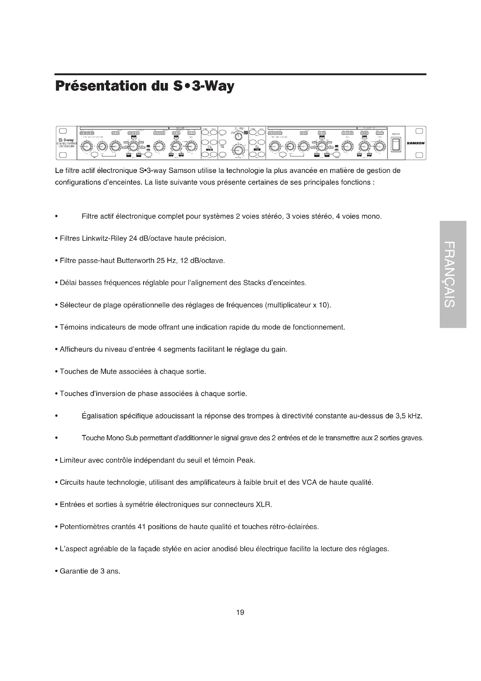 Présentation du S•3-Way Le filtre actif électronique S•3-way Samson utilise la technologie la plus avancée en matière de gestion de configurations d’enceintes. La liste suivante vous présente certaines de ses principales fonctions :
