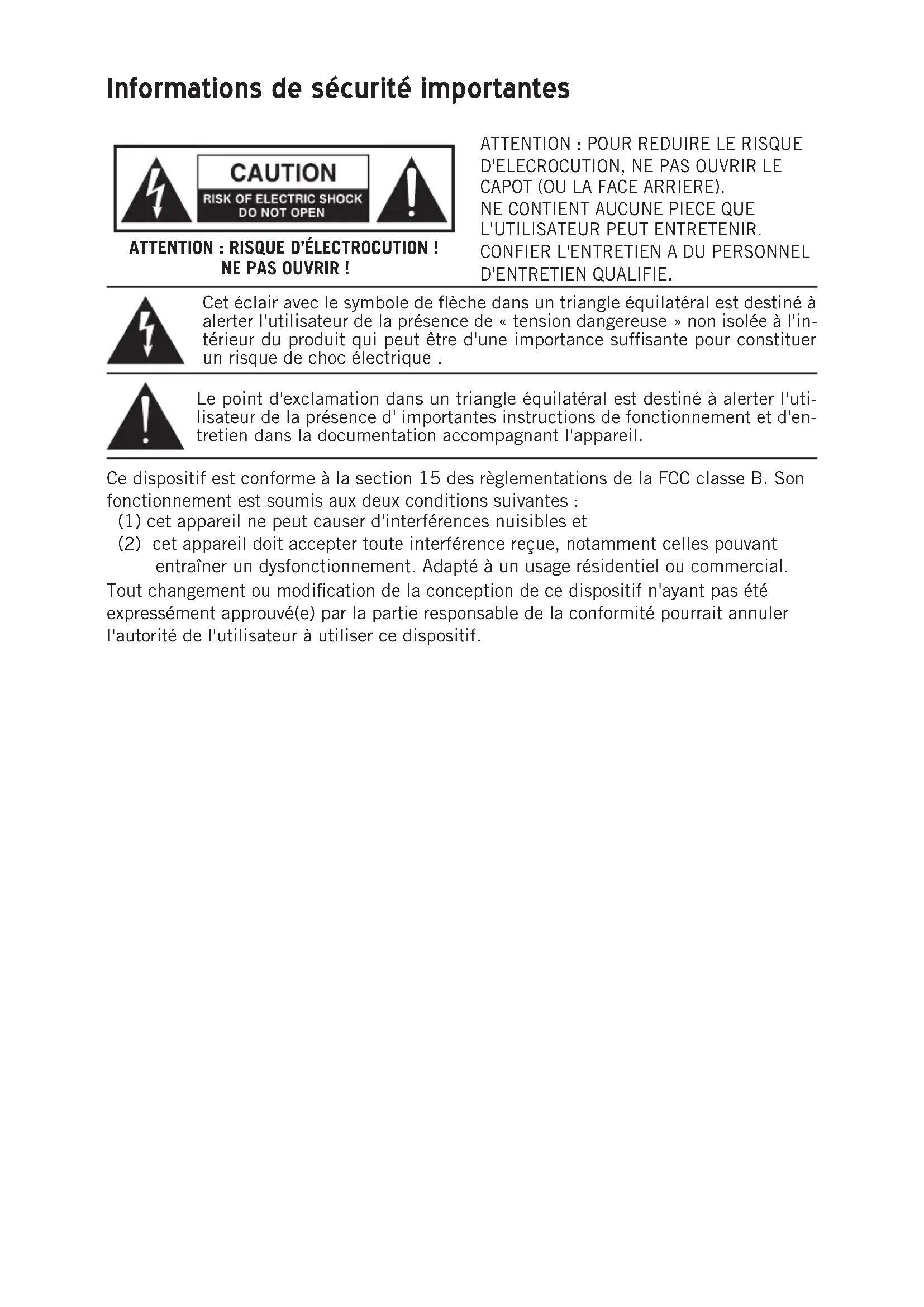 Cet éclair avec le symbole de flèche dans un triangle équilatéral est destiné à alerter l'utilisateur de la présence de « tension dangereuse » non isolée à l'intérieur du produit qui peut être d'une importance suffisante pour constituer un risque de chic electrique.