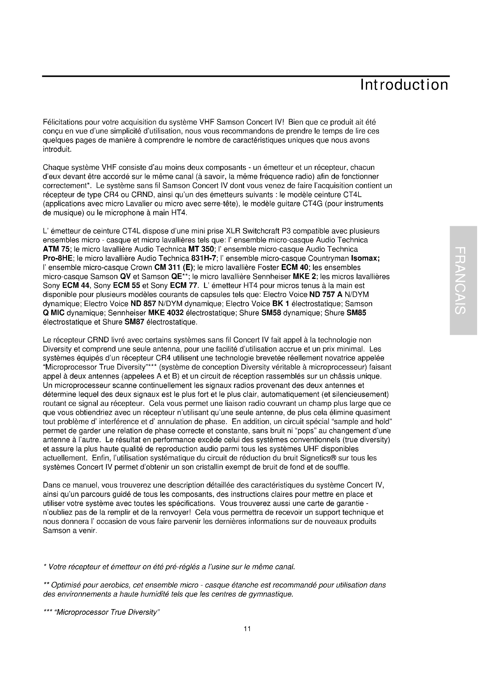 Félicitations pour votre acquisition du système VHF Samson Concert IV! Bien que ce produit ait est concu en vue d'une simplicité d'utilisation, nous vous recommendons de prendre le temps de dire ces quelques pages de manière à comprendre le nombre de caractéristiques-Uniques que nous avons introduit.