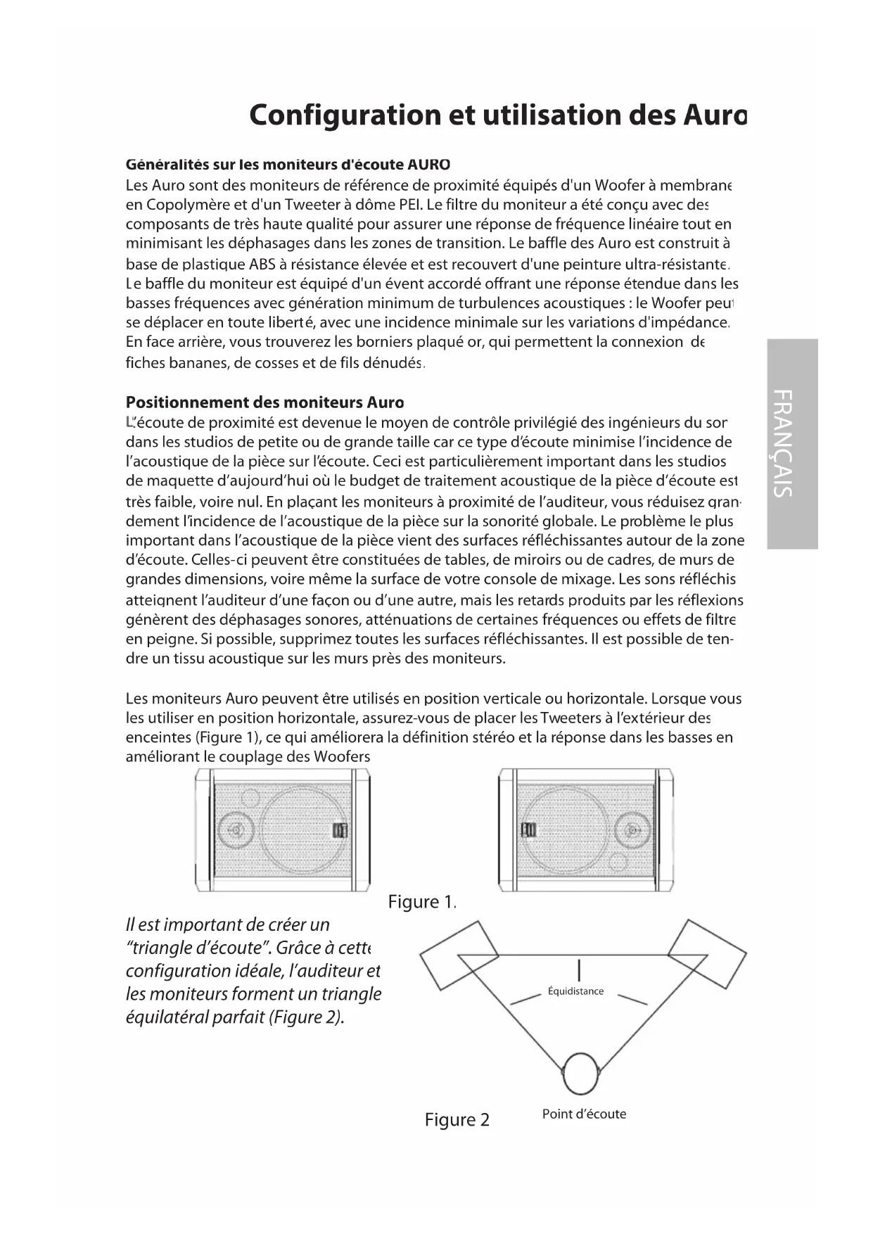 FRANÇAIS Configuration et utilisation des Auro Généralités sur les moniteurs d'écoute AURO Les Auro sont des moniteurs de référence de proximité équipés d'un Woofer à membrane en Copolymère et d'un Tweeter à dôme PEI. Le filtre du moniteur a été conçu avec des composants de très haute qualité pour assurer une réponse de fréquence linéaire tout en minimisant les déphasages dans les zones de transition. Le baffle des Auro est construit à base de plastique ABS à résistance élevée et est recouvert d'une peinture ultra-résistante
