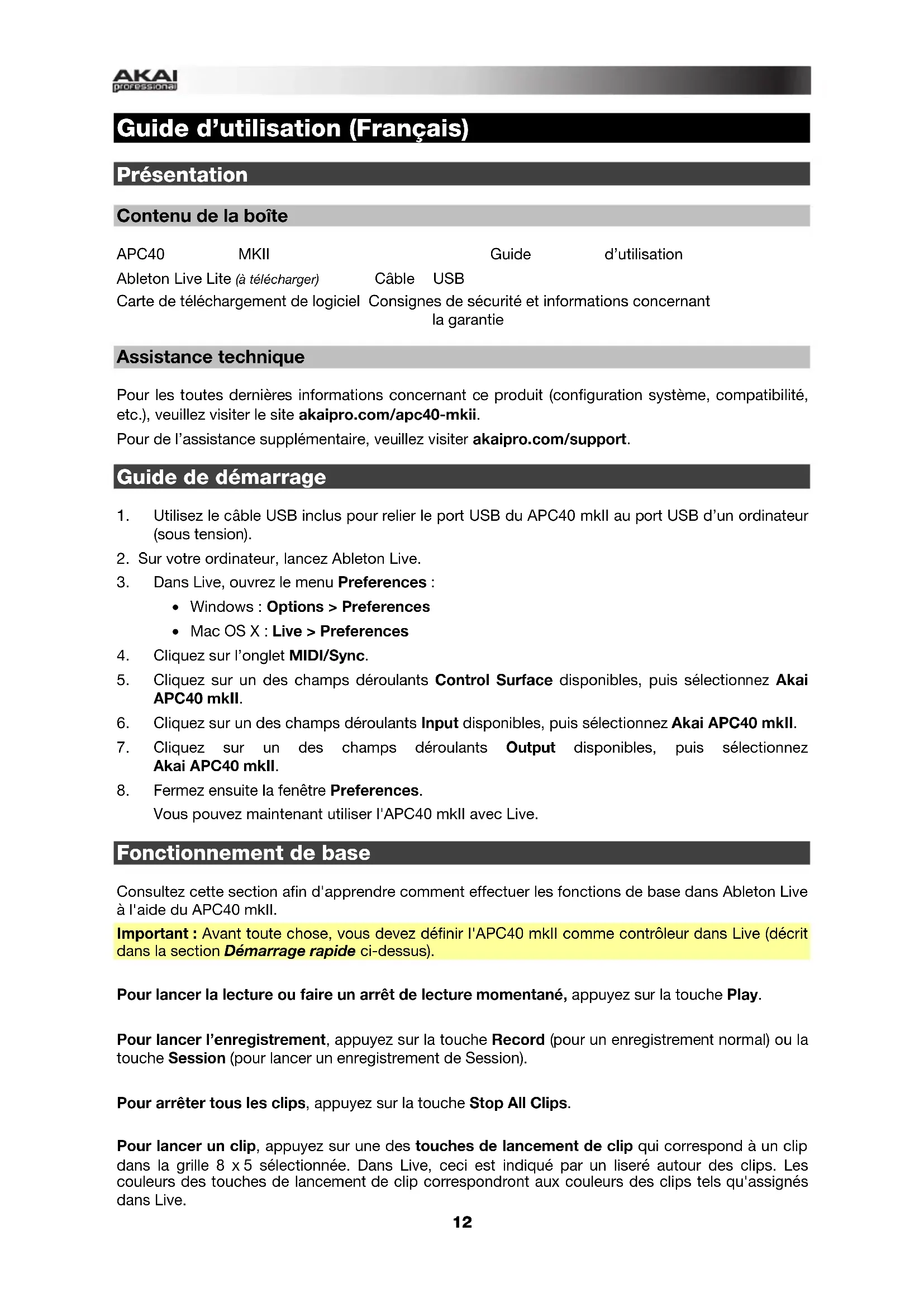 Guide d’utilisation (Français) Présentation Contenu de la boîte APC40 MKII Guide d’utilisation Ableton Live Lite (à télécharger) Câble USB Carte de téléchargement de logiciel Consignes de sécurité et informations concernant la garantie Assistance technique Pour les toutes dernières informations concernant ce produit (configuration système, compatibilité, etc.), veuillez visiter le site akaipro.com/apc40-mkii. Pour de l’assistance supplémentaire, veuillez visiter akaipro.com/support. Guide de démarrage