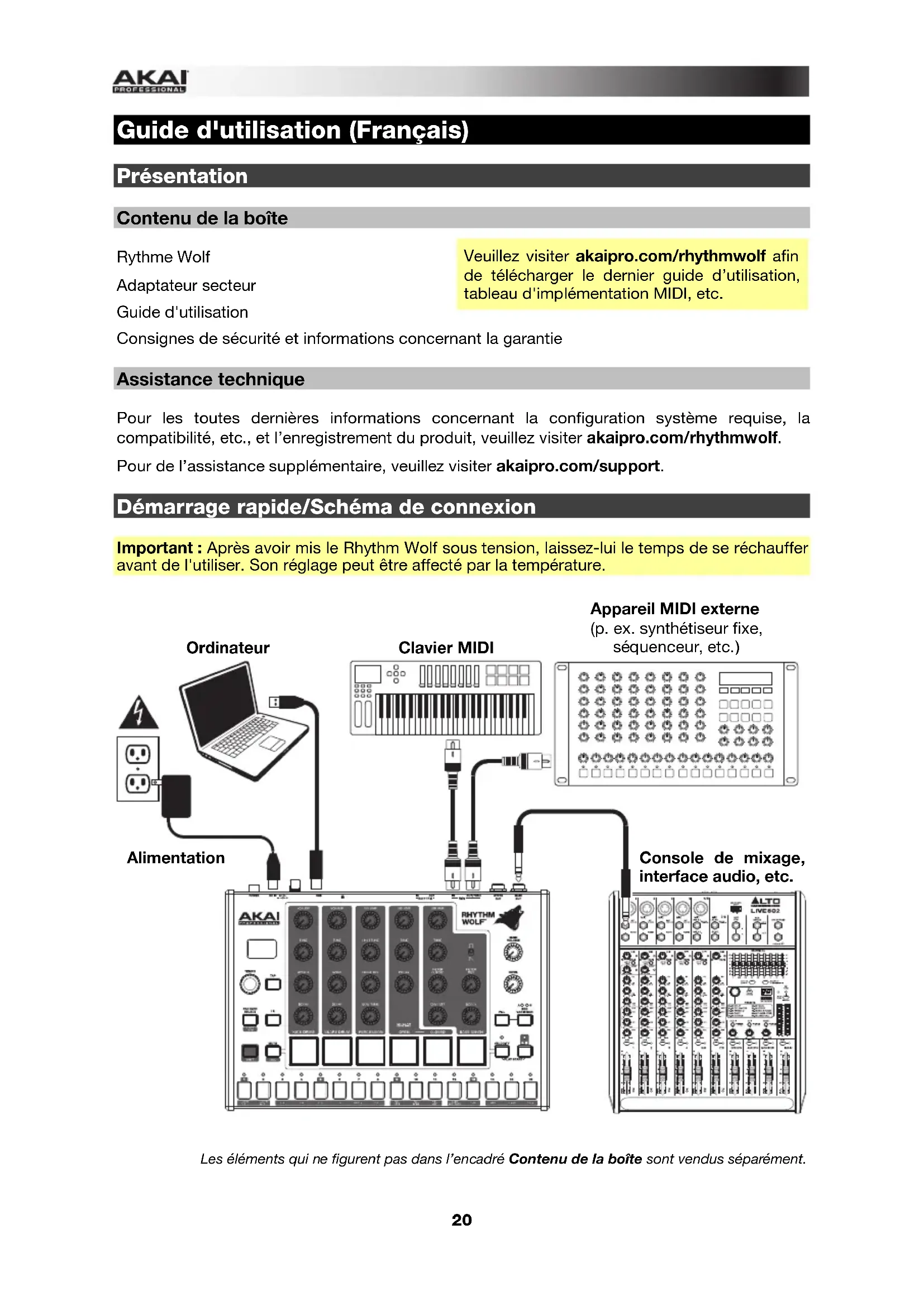 Guide d'utilisation (Français) Présentation Contenu de la boîte Rythme Wolf Adaptateur secteur Guide d'utilisation Consignes de sécurité et informations concernant la garantie Assistance technique Pour les toutes dernières informations concernant la configuration système requise, la compatibilité, etc., et l’enregistrement du produit, veuillez visiter akaipro.com/rhythmwolf. Pour de l’assistance supplémentaire, veuillez visiter akaipro.com/support. Démarrage rapide/Schéma de connexion Important : Après avoir mis le Rhythm Wolf sous tension, laissez-lui le temps de se réchauffer avant de l'utiliser. Son réglage peut être affecté par la température.