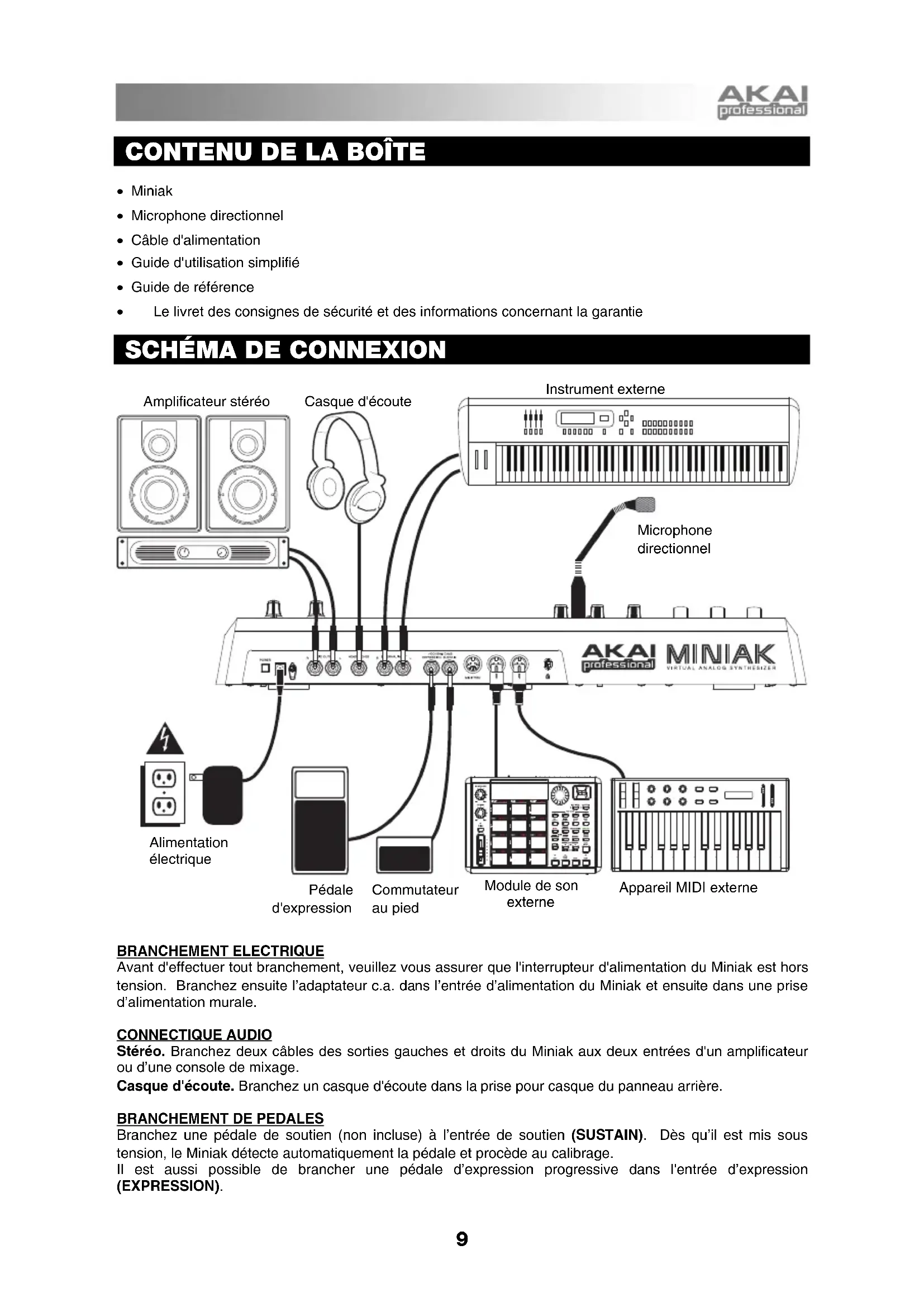 BRANCHEMENT ELECTRIQUE Avant d'effectuer tout branchement, veuillez vous assurer que l'interrupteur d'alimentation du Miniak est hors tension. Branchez ensuite l’adaptateur c.a. dans l’entrée d’alimentation du Miniak et ensuite dans une prise d’alimentation murale. CONNECTIQUE AUDIO Stéréo. Branchez deux câbles des sorties gauches et droits du Miniak aux deux entrées d'un amplificateur ou d’une console de mixage. Casque d'écoute. Branchez un casque d'écoute dans la prise pour casque du panneau arrière.