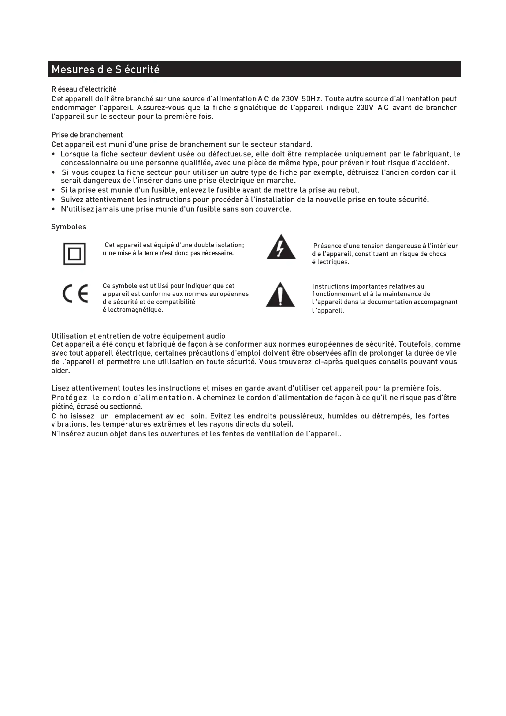 Présence d'une tension dangereuse à l'intérieur d e l'appareil, constituant un risque de chocs é lectriques. Instructions importantes relatives au f onctionnement et à la maintenance de l 'appareil dans la documentation accompagnant l 'appareil. Utilisation et entretien de votre équipement audio Cet appareil a été conçu et fabriqué de façon à se conformer aux normes européennes de sécurité. Toutefois, comme avec tout appareil électrique, certaines précautions d'emploi doivent être observées afin de prolonger la durée de vie de l'appareil et permettre une utilisation en toute sécurité. Vous trouverez ci-après quelques conseils pouvant vous aider. Lisez attentivement toutes les instructions et mises en garde avant d'utiliser cet appareil pour la première fois. Pro tégez le cordon d'alimentation. A cheminez le cordon d'alimentation de façon à ce qu'il ne risque pas d'être piétiné, écrasé ou sectionné. C ho isissez un emplacement av ec soin. Evitez les endroits poussiéreux, humides ou détrempés, les fortes vibrations, les températures extrêmes et les rayons directs du soleil. N'insérez aucun objet dans les ouvertures et les fentes de ventilation de l'appareil.Faites des économies d'énergie. Coupez l'alimentation à la source ou débranchez le cordon d'alimentation lorsque vous n'utilisez pas l'appareil, à moins que le fonctionnement de l'appareil ne nécessite une alimentation en continu. C essez immédiatement toute utilisatio n si des liquides se sont déversés à l'intérieur de l'appareil, si l'appareil est endommagé de quelque manière que ce soit ou s'il ne semble pas fonctionner normalement. Débranchez l'appareil de sa source d'alimentation et faites appel à un technicien qualifié. Débranchez le c ordo n d 'alimentatio n de la prise murale pendant un orage. C et appareil est d estiné à u n u sage ménager uniquement. Toute u tilisation d e c et appareil à d es fins autres q ue c elles p révues p eut p résenter des d angers e t inv alider la g arantie. Ventilation Posez l'appareil sur une surface plane et solide à l'abri des rayons directs du soleil et des sources de chaleur. Si l'appareil est posé sur une étagère ou un meuble de rangement, maintenez une distance d'au moins 10cm tout autour de l'appareil. Veillez à ne pas obstruer les trous d'aération, y compris ceux situés sur l'envers de l'appareil, en posant l'appareil sur un tapis ou sur de la moquette, afin d'éviter toute surchauffe pouvant réduire considérablement la durée de vie de l'appareil et causer des incendies. Nettoyage Débranchez toujours l'appareil avant de le nettoyer. Nettoyez le corps de l'appareil avec un chiffon doux légèrement humide. N'utilisez pas de solvants chimiques ni de détergents puissants au risque d'endommager la finition. Piles Enlevez les piles si vous ne comptez pas utiliser l'appareil pendant un certain temps. Les piles laissées à l'intérieur de l'appareil peuvent couler et corroder les pièces internes de l'appareil et invalider la garantie. Procédez à une mise au rebut de vos piles usées dans le respect de l'environnement en faisant usage des points de collecte et de recyclage prévus à cet effet. M ise au rebut L es appareils électriques et électroniques ne doivent pas être mis au rebut avec le reste de vos o rdures ménagères. D emandez à v otre revendeur quelles sont les mesures de recyclage a ppropriées pour ce type de produit. R ecyclez v os piles usées et les matériaux d'emballage en f aisant usage des points de collecte et de recyclage prévus à c et effet. I mportantes Mesures de Sécurité Pour éviter les risques de chocs électriques, n'ouvrez pas le boîtier de l'appareil. En cas de panne ou de mauvais fonctionnement, n'essayez pas d'y remédier vous-même. Faites appel à un technicien qualifié. M aintenez l'appareil à l'abri des éclaboussures et veillez à ne pas poser d'objets remplis d'eau ou de tout autre liquide (vases, etc.) sur l'appareil. Ne laissez pas cet appareil à proximité d'une flamme nue. Ne laissez pas de jeunes enfants s'amuser avec cet appareil. Contient des pièces de petite taille pouvant être ingérées. N'utilisez pas cet appareil lorsque vous êtes au volant. Produit laser de classe 1 C et appareil est muni d'un dispositif laser de faible puissance. Rayon laser invisible en cas d'ouverture ou de d éfaillance du mécanisme de verrouillage. Evitez toute exposition au rayon. Mesures d e S écurité A pleine puissance, l'écoute prolongée du baladeur peut endommager l'oreille de l'utilisateur. Pensez à ajuster le volume à un niveau normal,et non pas au maximum.16