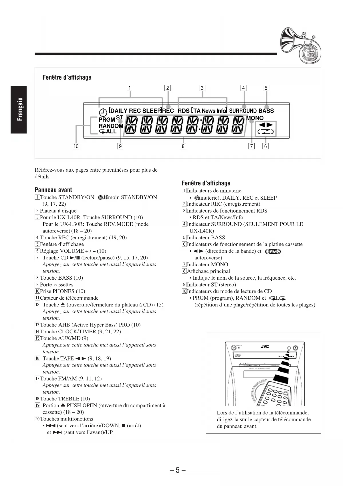 - Spécifications FR01-14_UX-L40R&30R[E]f.pm6 1/7/02, 6:35 PM2– 3 – Français Référez-vous aux pages entre parenthèses pour plus dedétails. Télécommande 1 Touches numériques2 Touche BASS (10)3 Touches multifonctions p. 26