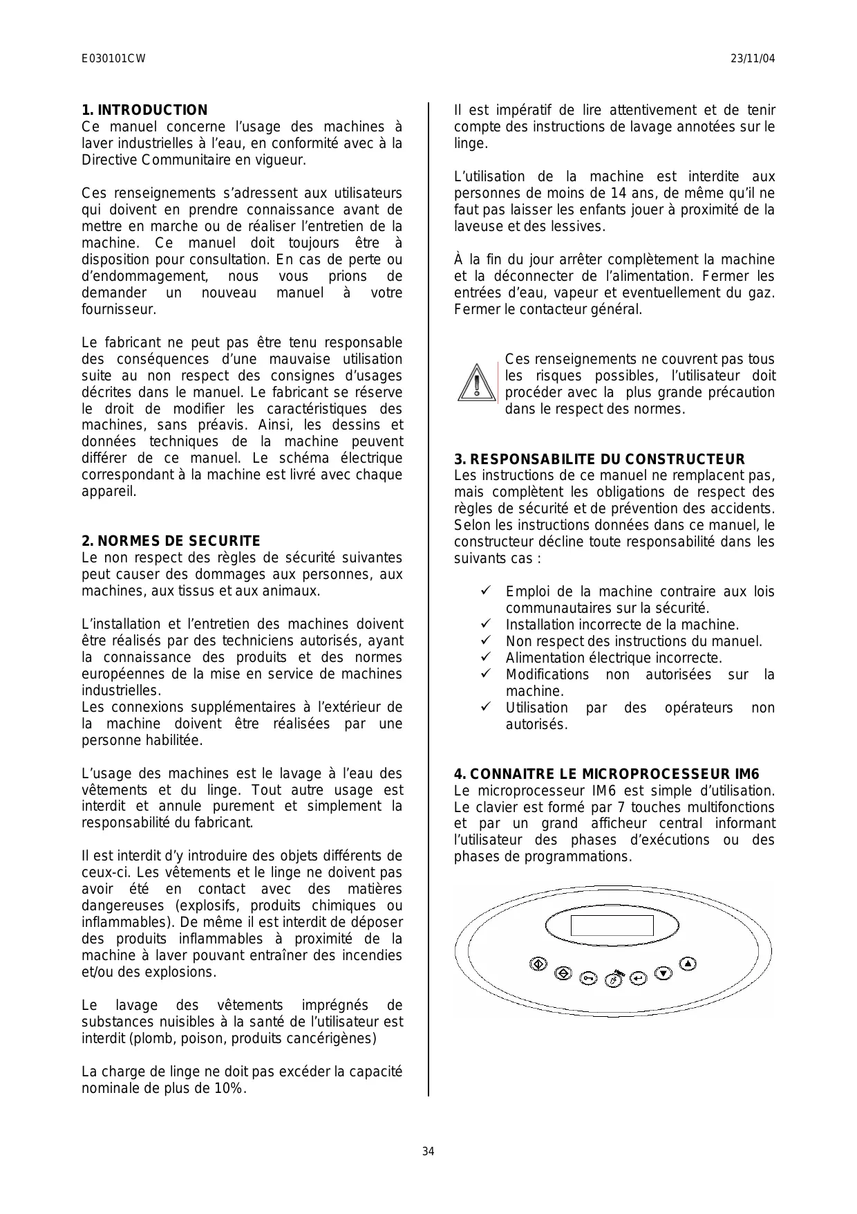 Le microprocesseur IM6 est simple d’utilisation. Le clavier est formé par 7 touches multifonctions et par un grand afficheur central informant l’utilisateur des phases d’exécutions ou des phases de programmations. Il est interdit d’y introduire des objets différents de ceux-ci. Les vêtements et le linge ne doivent pas avoir été en contact avec des matières dangereuses (explosifs, produits chimiques ou inflammables). De même il est interdit de déposer des produits inflammables à proximité de la machine à laver pouvant entraîner des incendies et/ou des explosions. Le lavage des vêtements imprégnés de substances nuisibles à la santé de l’utilisateur est interdit (plomb, poison, produits cancérigènes) La charge de linge ne doit pas excéder la capacité nominale de plus de 10%.