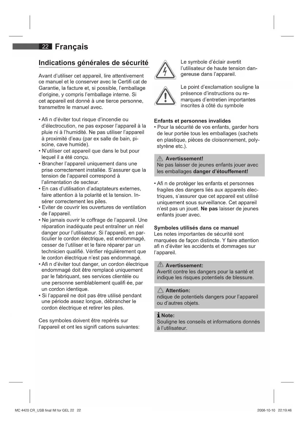 - Refermer le compartiment à pile. Français MC 4420 CR_USB final IM for GEL 23 23MC 4420 CR_USB final IM for GEL 23 23 2008-10-10 22:19:482008-10-10 22:19:4824 Si l’appareil ne doit pas être utilisé pendant longtemps, retirer la pile afi n d’éviter que l’acide ne coule. Attention: Les piles ne doivent pas être jetées avec les ordures ménagères. Veuillez porter les piles usagées à un point de collecte compétent ou les rendre au vendeur. Avertissement