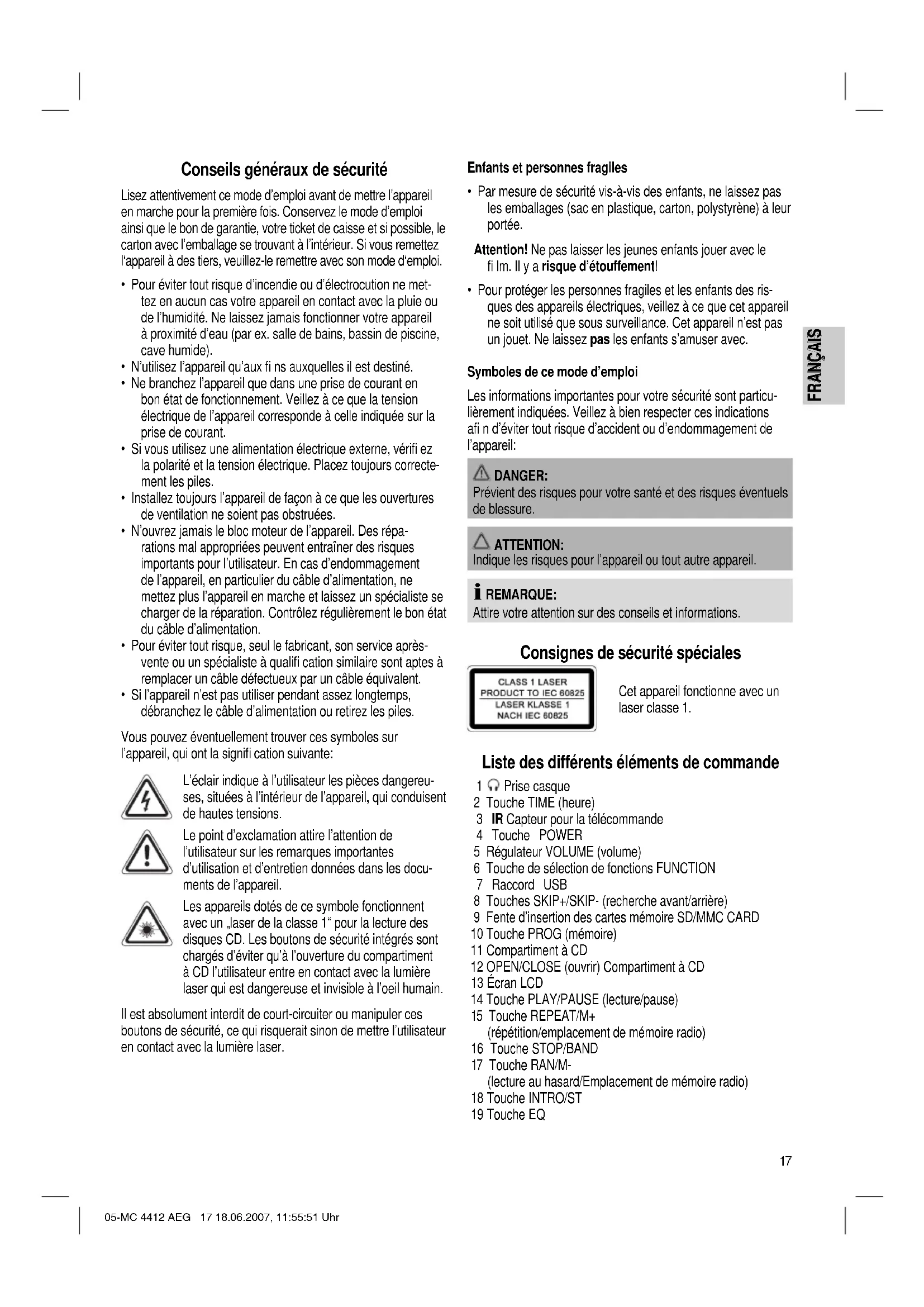 Prévient des risques pour votre santé et des risques éventuels de blessure. ATTENTION: Indique les risques pour l’appareil ou tout autre appareil. REMARQUE: Attire votre attention sur des conseils et informations. Consignes de sécurité spéciales Cet appareil fonctionne avec un laser classe 1. Liste des différents éléments de commande 1 Prise casque 2 Touche TIME (heure) 3 IR Capteur pour la télécommande 4 Touche POWER 5 Régulateur VOLUME (volume) 6 Touche de sélection de fonctions FUNCTION 7 Raccord USB 8 Touches SKIP+/SKIP- (recherche avant/arrière) 9 Fente d’insertion des cartes mémoire SD/MMC CARD 10 Touche PROG (mémoire) 11 Compartiment à CD 12 OPEN/CLOSE (ouvrir) Compartiment à CD 13 Écran LCD 14 Touche PLAY/PAUSE (lecture/pause) 15 Touche REPEAT/M+ (répétition/emplacement de mémoire radio) 16 Touche STOP/BAND 17 Touche RAN/M- (lecture au hasard/Emplacement de mémoire radio) 18 Touche INTRO/ST 19 Touche EQ 05-MC 4412 AEG 17 18.06.2007, 11:55:51 Uhr18 FRANÇAIS FRANÇAIS Face arrière (sans illustration) 20 Raccordements haut-parleurs SPEAKER R/L 21 Raccordement électrique AC 22 Antenne fl exible FM ANT. 23 Branchement d’antenne AM ANT. 24 Entrée AUX 25 Interrupteur POWER ON/OFF Télécommande 1 Touche PLAY/PAUSE (lecture/pause) 2 Touche STOP 3 Touches