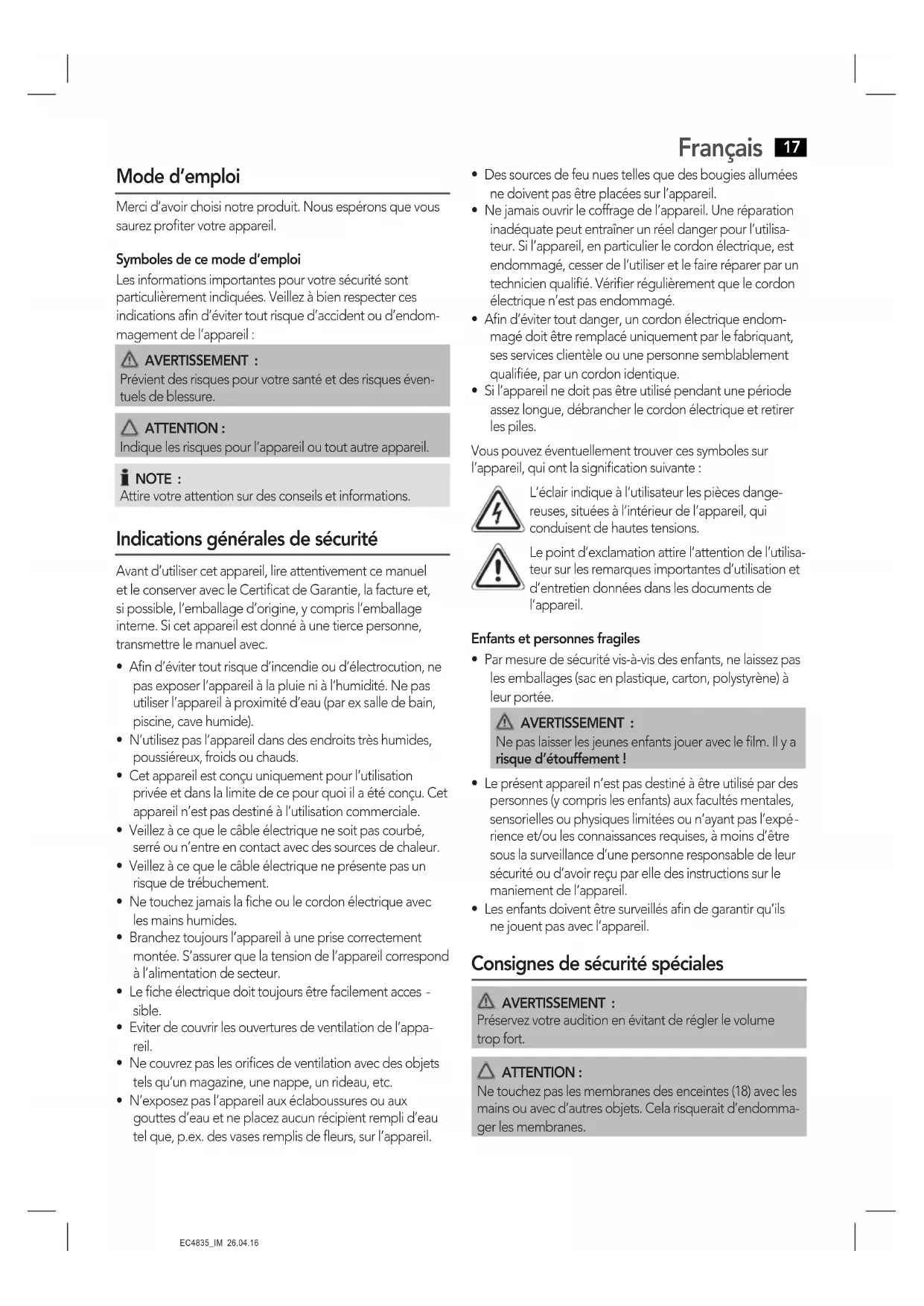 - Vous pouvez nettoyer les salissures externes à l’aide d’un chiffon légèrement humidifi é, sans aucun additif. Dépannage Problème Cause Solution L’appareil ne fonctionne pas. L’appareil est bloqué et “ne répond plus”. Débranchez l’ali- mentation pendant 5s puis rallumez l’appareil. Aucun son. Le volume est trop bas. Augmentez le volume. Mauvaise qualité du son. Le signal radio est trop faible. Essayez de régler la position de l’antenne. Problème Cause Solution Aucun signal audio pendant la connexion Bluetooth. L’appareil n’est pas enregistré avec la source audio. Assurez-vous qu’il y a une connexion. Enregistrez de nou- veau l’appareil avec la source audio, si nécessaire. Volume trop bas. Augmentez le vo- lume de l’appareil. Augmentez le volume de la source audio. L’appareil ne se connecte pas. L’enregistrement ne fonctionne pas. Vérifi ez que la source audio supporte le protocole A2DP. La source audio est éteinte. Allumez la source audio. Le Bluetooth de la source audio est éteint. Activez la fonction Bluetooth de la source audio. La version Blue- tooth n’est pas supportée. Utilisez un autre lecteur. Bruit de siffl ement aigu pendant le fonction- nement du microphone. Réactions acous- tiques. Utilisez le microphone hors de la distance de réverbération du haut-parleur. Données techniques Modèle : ................................................................................ EC 4835 Alimentation : .......................................... CA 100 − 240 V, 50 / 60 Hz Consommation : ........................................................................ 42 W Classe de protection :...................................................................... Poids net : .................................................................environ 8,15 kg Partie radio Gammes de fréquence : .......................FM 87,5 ~ 108,0 MHz Bluetooth Prise en charge Bluetooth : ...........................................V 2.1+EDR Portée : ................................................................ 15 mètres environ Fréquences de transmission : .......................... 2,402 − 2,480 GHz Protocoles : ................................................................ A2DP / AVRCP Nous nous réservons le droit d’apporter des modifi cations techniques ainsi que des modifi cations de conception dans le cadre du développement continu de nos produits. Cet appareil est conforme à toutes les directives CE en vigueur, telles que les directives sur la compatibilité électro- magnétique et les faibles tensions et a été fabriqué selon les derniers règlements de sécurité.22 Français