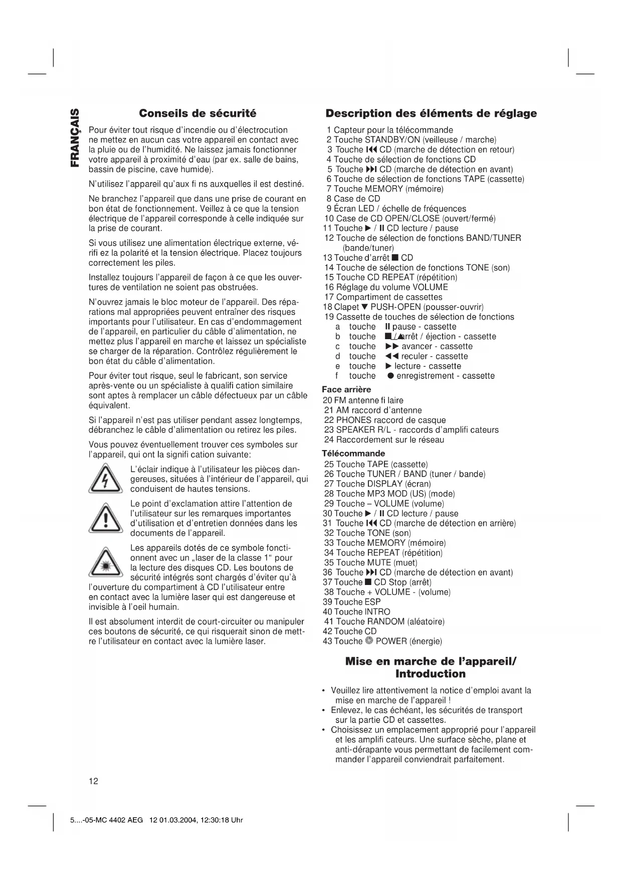 lecture et effacer le programme. Vous avez la possibilité de combiner les titres program- més à l’aide de la fonction REPEAT. Après avoir pro- grammé et démarré l’appareil, veuillez appuyer jusqu’à 3 x sur la touche REPEAT et les fonctions peuvent alors être appliquées selon la description au paragraphe « REPEAT ». Description des touches CD sur la télécommande TAPE (25): Change dans le mode TAPE (partie cassette). TUNER / BAND (26): Change dans le mode radio. DISPLAY (27): Pour un CD en cours (sauf en mode MP3) Appuyer 1 x : La durée totale de lecture des titres est comptée à rebours. Appuyer 2 x : La durée totale de lecture du CD total est comptée à rebours. Appuyer 3 x : La chanson en cours et la durée écoulée sont de nouveau affi chées sur l’écran. MP3 MOD (28): Change vers le mode MP3. / II (30): Lance le CD. Vous pouvez temporaire- ment interrompre la lecture. Veuillez de nouveau appuyer sur la touche PLAY. Le voyant lumineux de l’écran clignote. I / I (31/36): Ces touches vous permettent de sauter vers le titre suivant ou le titre d’après, etc. Maintenir enfoncée la touche pour faire démarrer la marche de détection de musique, TONE (32): Cf. au paragraphe « TONE » MEMORY (33): Cf. au paragraphe « lecture program- mée » REPEAT (34): Cf. au paragraphe « REPEAT ». MUTE (35): Sert à supprimer rapidement le volume. Pour annuler cette fonction, appuyer de nouveau sur la touche MUTE. Stop (37): Le CD est arrêté. L’écran clignote et affi che le mot « MUTE ». ESP (39): Désactive / active la fonction anti-choc avec un CD audio dans le compar- timent (sauf dans le mode MP3). Appuyer sur STOP et actionner jusqu’à 2 x la touche ESP. L’écran affi che ESP ON voire OFF. En cas de dysfonction- nement, les données de musique sur CD sont lues sans troubles à partir d’une mémoire temporaire. Les erreurs de lecture sont corrigées à posteriori dans la mémoire temporaire. INTRO (40): Démarre la lecture de tous les titres CD pendant env. 10 secondes pour ensuite sauter au titre suivant (à l’exception du mode MP3). RANDOM (41): Appuyer sur la touche RANDOM pour une lecture de tous les titres dans un ordre aléatoire (à l’exception du mode MP3). L’écran affi che la fonction RANDOM. Appuyer de nouveau sur la touche pour annuler toutes les fonctions. La lecture se poursuit normalement. CD (42): Change vers le mode CD. Fonctions spéciales MP3 - CD Avec votre appareil, vous pouvez écouter des CD MP3. Ces CD permettent d’enregistrer jusqu’à 200 titres comprimés. Votre appareil reconnaît automatiquement un CD MP3. L’écran affi che MP3, la qualité du son étant ainsi conservée. Pour la lecture de ce type de CD veuillez procéder selon la description de la lecture pour CD. Cet appareil a été contrôlé d’après toutes les directives européennes actuelles applicables, comme par exemple concernant la compatibilité électromagnétique et la basse tension. Cet appareil a été fabriqué en respect des régle- mentations techniques de sécurité les plus récentes. Sous réserve de modifi cations techniques. Garantie Nous accordons une garantie de 24 mois à dater de la date d’achat (ticket de caisse) pour l’appareil que nous vendons. Pendant la durée de la garantie, nous éliminons gra- tuitement les défauts de l’appareil ou des accessoires *) découlant d’un vice de matériau ou de fabrication au moyen d’une réparation ou, selon notre estimation, au moyen d’un remplacement. Les prestations dans le cadre de la garantie n’entraînent aucune prorogation de la durée de garantie et ne donnent pas droit à une nouvelle garantie ! Le justifi catif de garantie est le reçu. Sans ce justifi catif, aucun remplacement gratuit ni aucune réparation gratui- te ne peuvent être effectués. En cas de recours à la garantie, rapportez l’appareil dans son emballage d’origine accompagné du ticket de caisse à votre revendeur. *) Les endommagements de pièces d’accessoires ne justifi ent pas automatiquement l’échange gratuit de l’appareil complet. Contactez alors notre centrale télé- phonique! La casse de pièces en verre ou en plastique est dans tous les cas à votre charge! 5....-05-MC 4402 AEG 15 01.03.2004, 12:30:21 Uhr16 FRANÇAIS Les défauts sur les accessoires ou les pièces d’usure (p.ex. les charbons de moteurs, crochets, courroies d’entraînement, télécommande de rechange, brosses à dents de rechange, lames de scies etc.) ainsi que le net- toyage, l’entretien ou le remplacement de pièces d’usure ne sont pas garantis et sont donc payants ! En cas d’intervention étrangère, la garantie devient caduque. Après la garantie Après écoulement de la durée de garantie, les répara- tions peuvent être effectuées, contre paiement, par le commerce spécialisé ou le service de réparation. 5....-05-MC 4402 AEG 16 01.03.2004, 12:30:22 Uhr17 ESPAÑOL Indicaciones generales para su seguridad Vd. no debe dejar expuesto el aparato ni a la lluvia ni a la humedad, a fi n de disminuir así el riesgo de incendio o de sacudida eléctrica. Por tanto, no debe utilizar el apa- rato cerca de agua – por ejemplo, cerca de la bañera, de una piscina o de un sótano húmedo. Utilice el aparato únicamente para la fi nalidad para la que ha sido construido. El aparato se ha de conectar únicamente a una caja de toma de corriente instalada reglamentariamente. Cerciórese de que la tensión indicada concuerda con la tensión de la caja de enchufe. Preste atención a que sea correcta la polaridad cuando se empleen fuentes de alimentación externas. Las pilas se han de introducir siempre correctamente. El aparato se ha de dejar puesto de modo que no se tapen los orifi cios de aireación existentes. Jamás se abrirá la carcasa del cuerpo del aparato. Las reparaciones mal hechas pueden generar considerables peligros para el usuario. En caso de estar deteriorado el aparato, en especial el cable de conectar a 