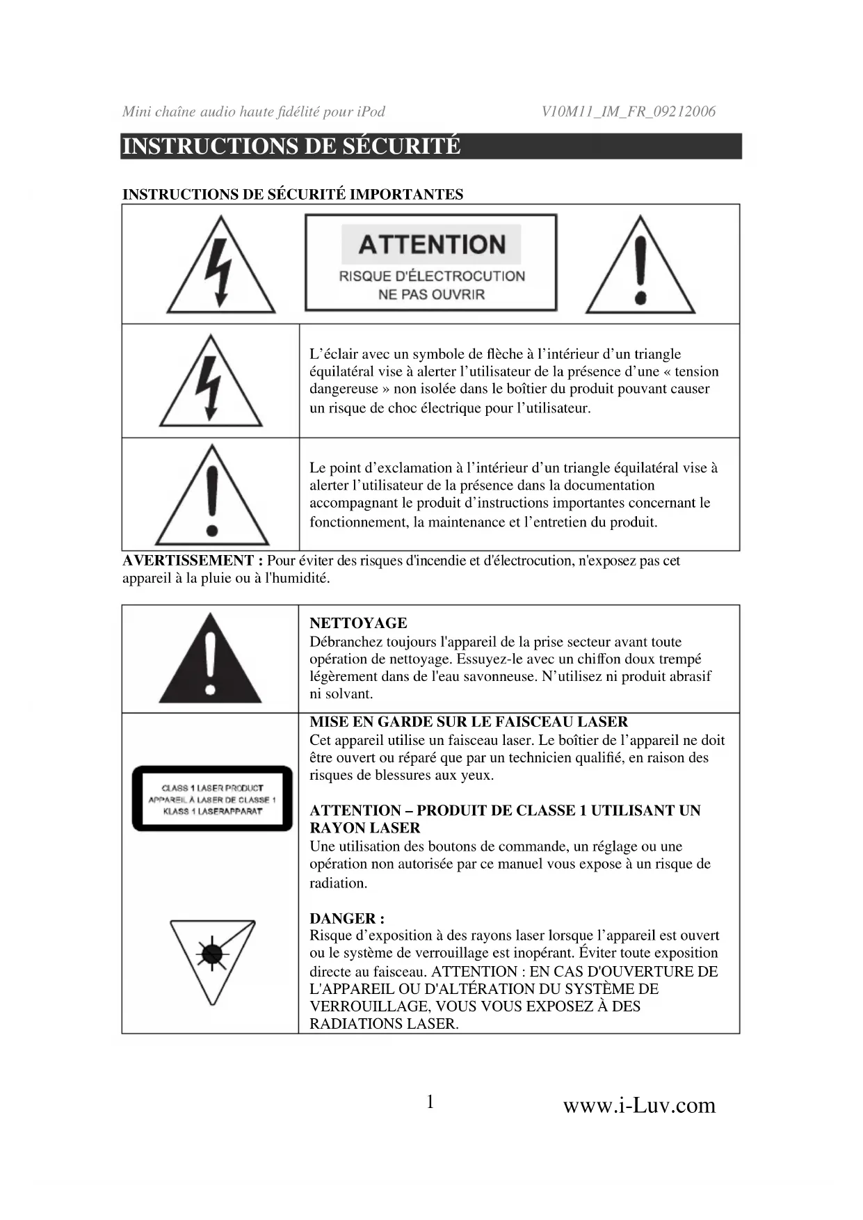 RADIATIONS LASER.Mini chaîne audio haute fidélité pour iPod V10M11_IM_FR_09212006 www.i-Luv.com