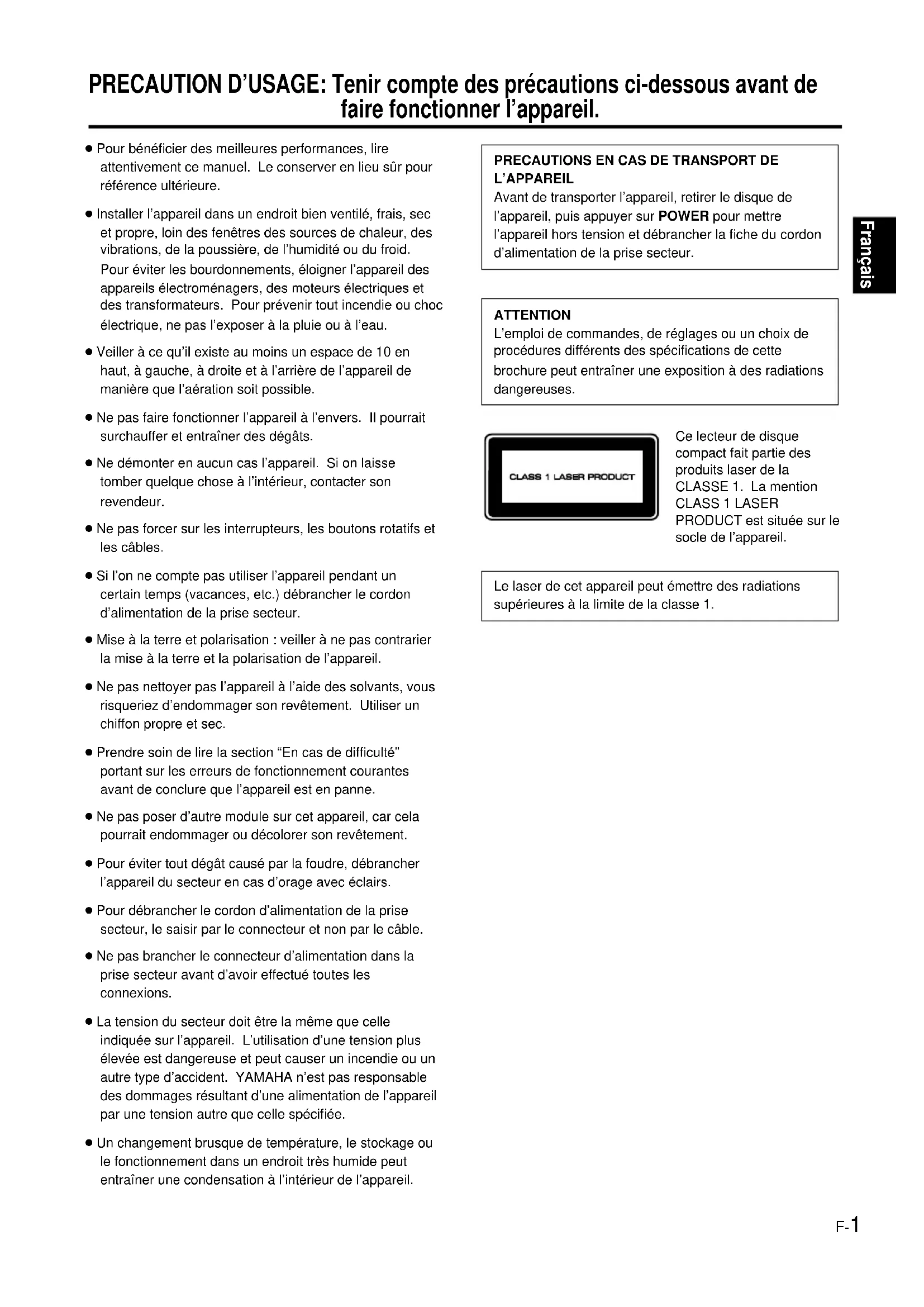 L’APPAREIL Avant de transporter l’appareil, retirer le disque de l’appareil, puis appuyer sur POWER pour mettre l’appareil hors tension et débrancher la fiche du cordon d’alimentation de la prise secteur. ATTENTION L’emploi de commandes, de réglages ou un choix de procédures différents des spécifications de cette brochure peut entraîner une exposition à des radiations dangereuses. Ce lecteur de disque compact fait partie des produits laser de la CLASSE 1. La mention CLASS 1 LASER PRODUCT est située sur le socle de l’appareil. Le laser de cet appareil peut émettre des radiations supérieures à la limite de la classe 1. ● Pour bénéficier des meilleures performances, lire attentivement ce manuel. Le conserver en lieu sûr pour référence ultérieure. ● Installer l’appareil dans un endroit bien ventilé, frais, sec et propre, loin des fenêtres des sources de chaleur, des vibrations, de la poussière, de l’humidité ou du froid. Pour éviter les bourdonnements, éloigner l’appareil des appareils électroménagers, des moteurs électriques et des transformateurs. Pour prévenir tout incendie ou choc électrique, ne pas l’exposer à la pluie ou à l’eau. ● Veiller à ce qu’il existe au moins un espace de 10 en haut, à gauche, à droite et à l’arrière de l’appareil de manière que l’aération soit possible. ● Ne pas faire fonctionner l’appareil à l’envers. Il pourrait surchauffer et entraîner des dégâts. ● Ne démonter en aucun cas l’appareil. Si on laisse tomber quelque chose à l’intérieur, contacter son revendeur. ● Ne pas forcer sur les interrupteurs, les boutons rotatifs et les câbles. ● Si l’on ne compte pas utiliser l’appareil pendant un certain temps (vacances, etc.) débrancher le cordon d’alimentation de la prise secteur. ● Mise à la terre et polarisation : veiller à ne pas contrarier la mise à la terre et la polarisation de l’appareil. ● Ne pas nettoyer pas l’appareil à l’aide des solvants, vous risqueriez d’endommager son revêtement. Utiliser un chiffon propre et sec. ● Prendre soin de lire la section “En cas de difficulté” portant sur les erreurs de fonctionnement courantes avant de conclure que l’appareil est en panne. ● Ne pas poser d’autre module sur cet appareil, car cela pourrait endommager ou décolorer son revêtement. ● Pour éviter tout dégât causé par la foudre, débrancher l’appareil du secteur en cas d’orage avec éclairs. ● Pour débrancher le cordon d’alimentation de la prise secteur, le saisir par le connecteur et non par le câble. ● Ne pas brancher le connecteur d’alimentation dans la prise secteur avant d’avoir effectué toutes les connexions. ● La tension du secteur doit être la même que celle indiquée sur l’appareil. L’utilisation d’une tension plus élevée est dangereuse et peut causer un incendie ou un autre type d’accident. YAMAHA n’est pas responsable des dommages résultant d’une alimentation de l’appareil par une tension autre que celle spécifiée. ● Un changement brusque de température, le stockage ou le fonctionnement dans un endroit très humide peut entraîner une condensation à l’intérieur de l’appareil. PRECAUTION D’USAGE: Tenir compte des précautions ci-dessous avant de faire fonctionner l’appareil.F-2