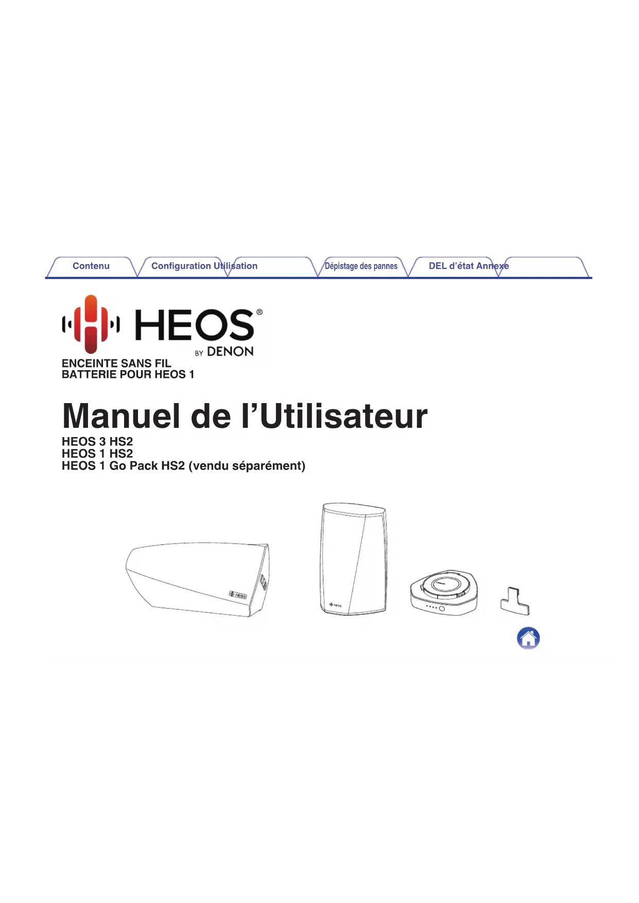 Manuel de l’Utilisateur HEOS 3 HS2 HEOS 1 HS2 HEOS 1 Go Pack HS2 (vendu séparément) Contenu Configuration Utilisation Dépistage des pannes DEL d’état Annexe 1Introduction