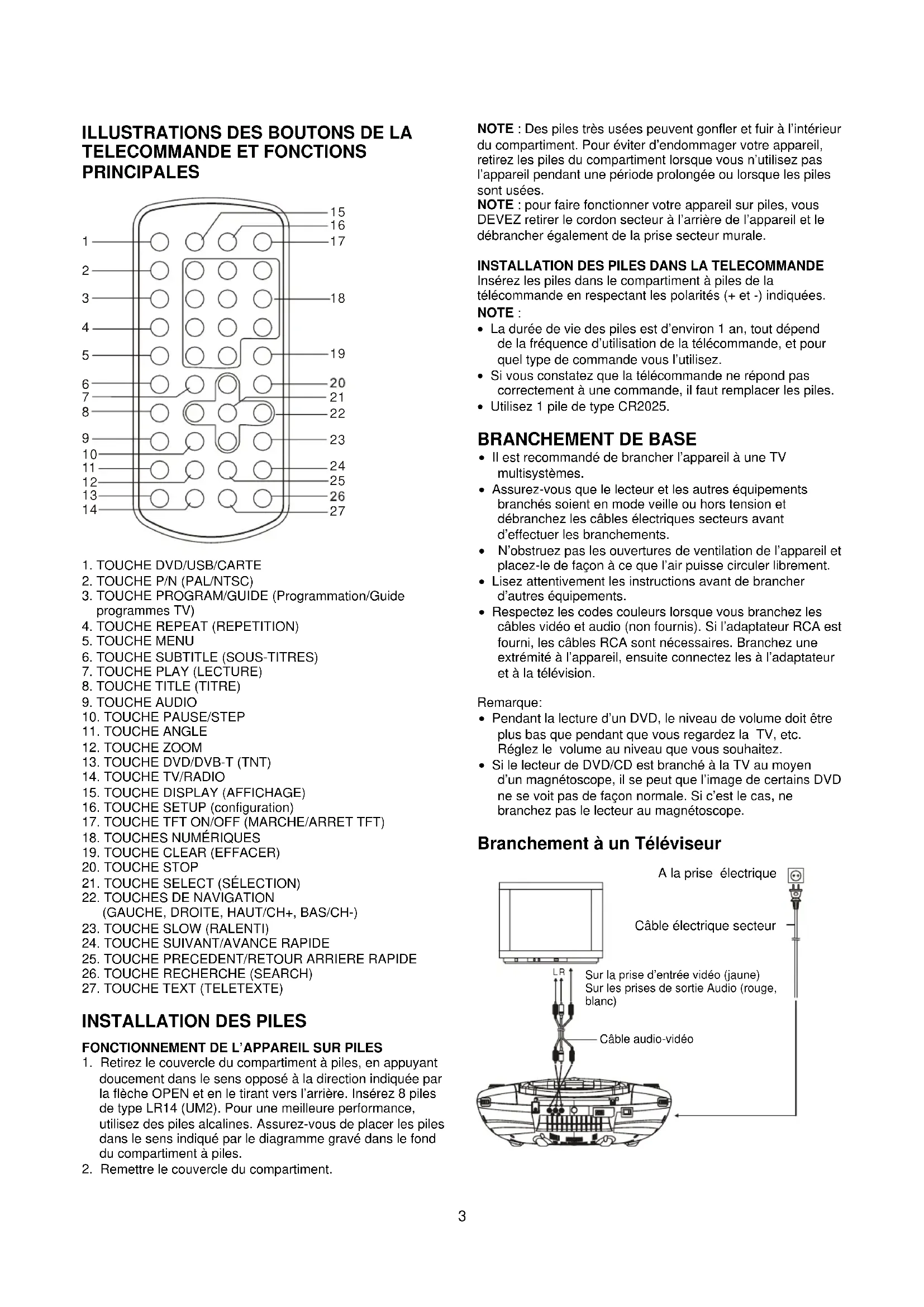 CARACTERISTIQUES TECHNIQUES Alimentation : Entrée CA 230 V. 50Hz DC 12 V. Piles 8 x LR-14 (UM2) Télécommande : s’utilise avec une pile CR2025 (non fournie) Gammes d’Ondes : AM/FM Gamme de fréquence : AM 540 – 1600 kHz FM 88 – 108 MHz Consommation : 28 W. Puissance de sortie : 2.5W. x 2 Système TV : NTSC / PAL / AUTO Température de fonctionnement : de + 5 ° à + 35°C Autonomie de temps de lecture en continue : 120 minutes Dimensions : 438,4 (L) x 242 (P) x 155 (H) mm Taux d’humidité pour le fonctionnement : de 10 à 75 % Résolution Ecran : 640 x 480 RGB Disques compatibles : CD, CD-R, CD-RW, DVD, DVD-R,