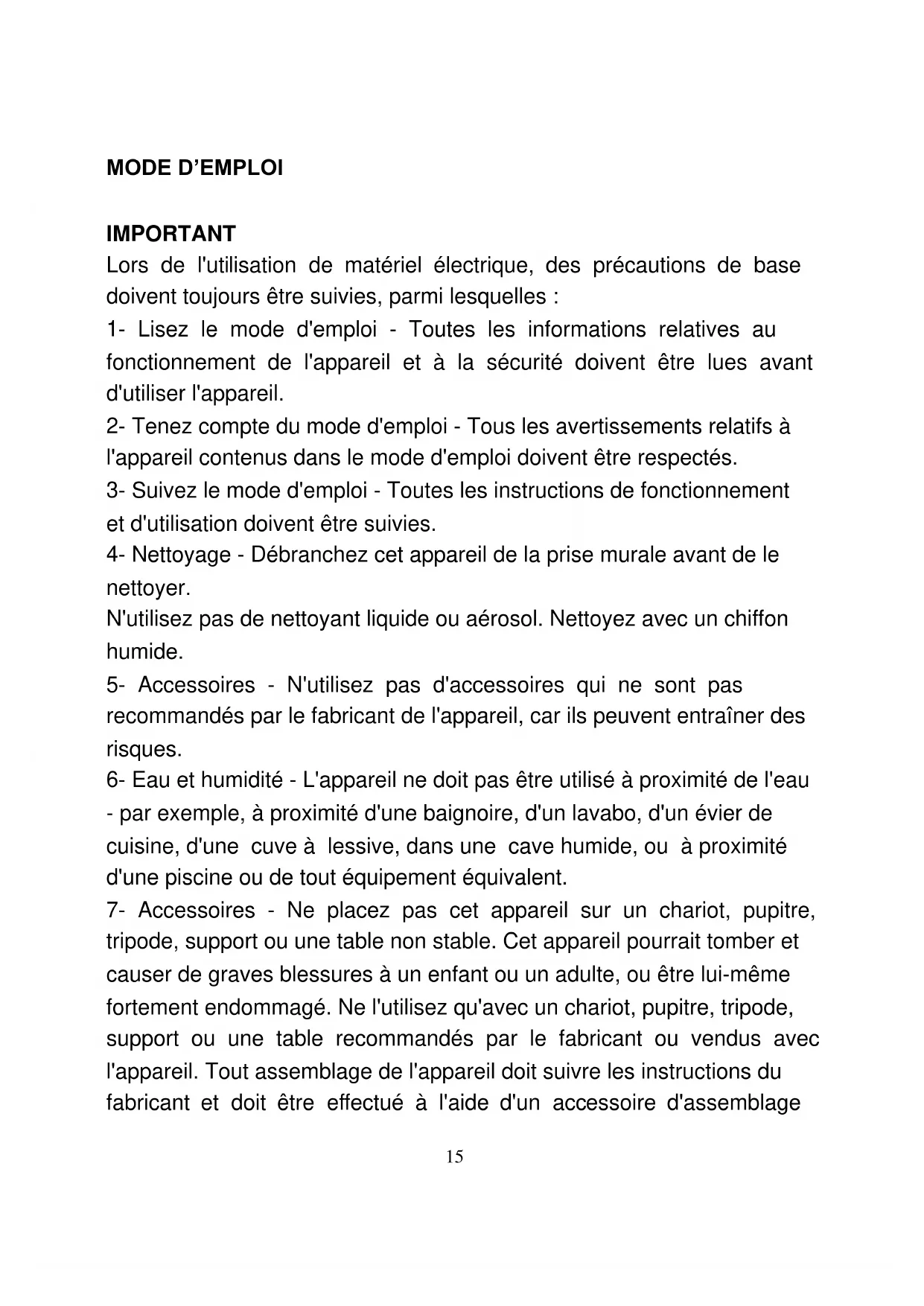 7- Accessoires - Ne placez pas cet apparéil sur un chariot, pùpâtre, tripode, support ou une table non stable. Cét apparéil pourrait tomber et causer de graves blessures à un enfant ou un adulte, ou être lui-même fortement endommagé. Ne l'utilisez qu'avac un chariot, pùpâtre, tripode, support ou une table recommends par le fabricant ou vendus avec l' apparéil. Tout assemblage de l' apparéil doit suivre les instructions du fabricant et doit être effectué à l'aide d'un accessoire d'assemblage