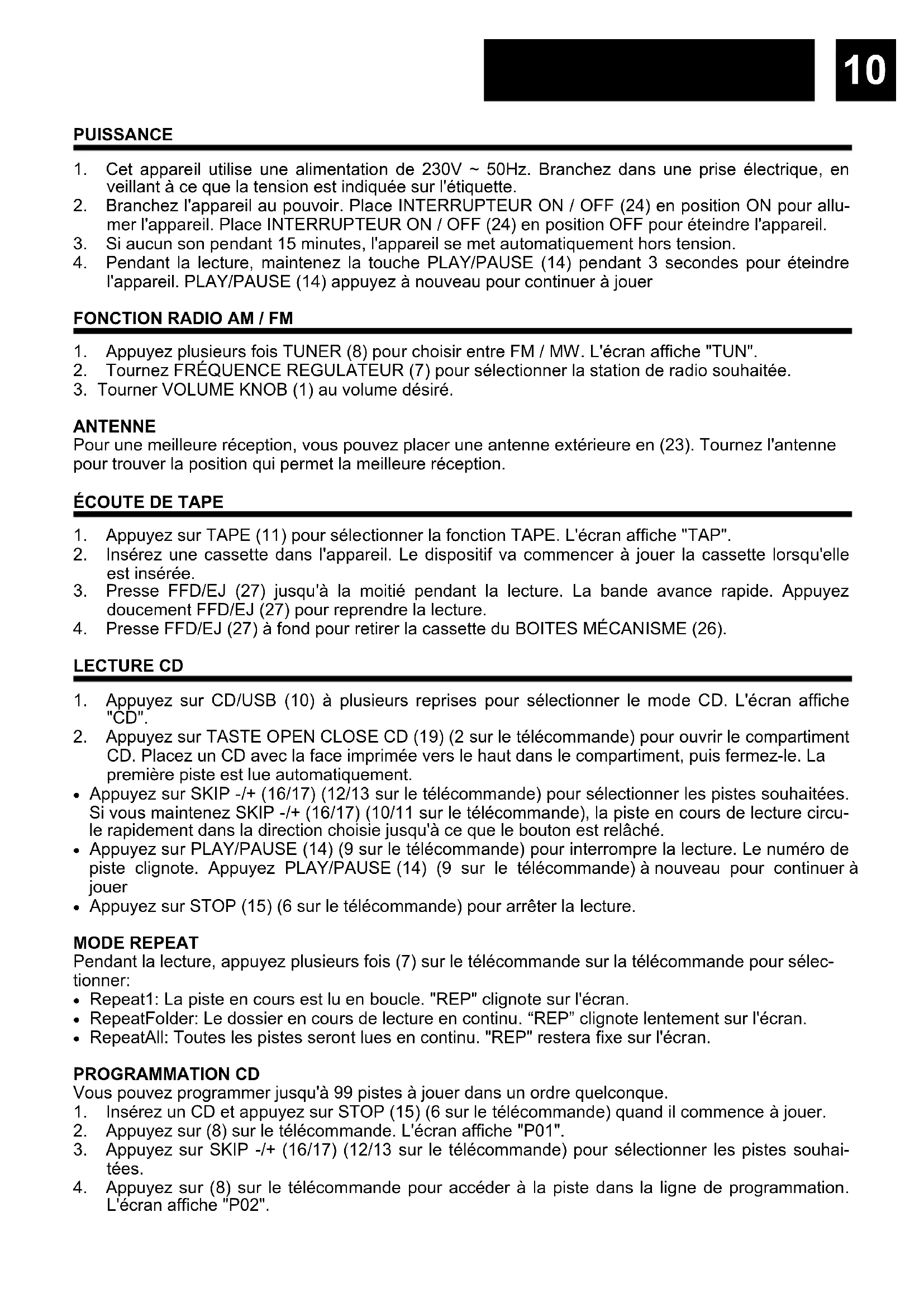CD. Placez un CD avec la face imprimée vers le haut dans le compartiment, puis fermez-le. La première piste est lue automatiquement. Appuyez sur SKIP -/+ (16/17) (12/13 sur le télécommande) pour sélectionner les pistes souhaitées. Si vous maintenez SKIP -/+ (16/17) (10/11 sur le télécommande), la piste en cours de lecture circu- le rapidement dans la direction choisie jusqu'à ce que le bouton est relâché. Appuyez sur PLAY/PAUSE (14) (9 sur le télécommande) pour interrompre la lecture. Le numéro de piste clignote. Appuyez PLAY/PAUSE (14) (9 sur le télécommande) à nouveau pour continuer à jouer Appuyez sur STOP (15) (6 sur le télécommande) pour arrêter la lecture. MODE REPEAT Pendant la lecture, appuyez plusieurs fois (7) sur le télécommande sur la télécommande pour sélec- tionner: Repeat1: La piste en cours est lu en boucle. "REP" clignote sur l'écran. RepeatFolder: Le dossier en cours de lecture en continu. “REP” clignote lentement sur l'écran. RepeatAll: Toutes les pistes seront lues en continu. "REP" restera fixe sur l'écran. PROGRAMMATION CD Vous pouvez programmer jusqu'à 99 pistes à jouer dans un ordre quelconque.