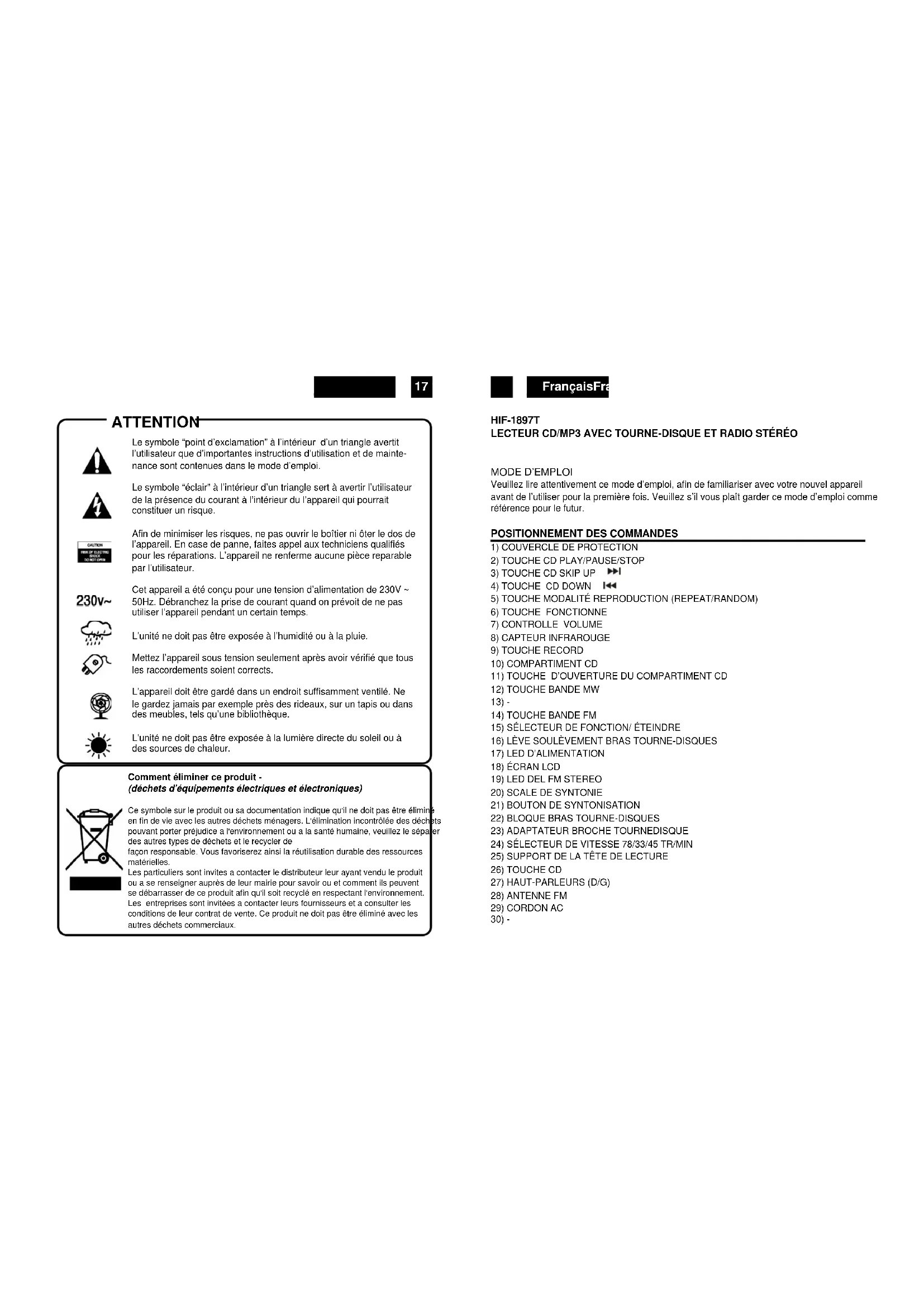 ATTENTION Le symbole “point d’exclamation” à l’intérieur d’un triangle avertit l’utilisateur que d’importantes instructions d’utilisation et de mainte- nance sont contenues dans le mode d’emploi. Le symbole “éclair” à l’intérieur d’un triangle sert à avertir l’utilisateur de la présence du courant à l’intérieur du l’appareil qui pourrait constituer un risque. Afin de minimiser les risques, ne pas ouvrir le boîtier ni ôter le dos de l’appareil. En case de panne, faites appel aux techniciens qualifiés pour les réparations. L’appareil ne renferme aucune pièce reparable par l’utilisateur. Cet appareil a été conçu pour une tension d’alimentation de 230V ~ 50Hz. Débranchez la prise de courant quand on prévoit de ne pas utiliser l’appareil pendant un certain temps. L’unité ne doit pas être exposée à l’humidité ou à la pluie. Mettez l’appareil sous tension seulement après avoir vérifié que tous les raccordements soient corrects. L’appareil doit être gardé dans un endroit suffisamment ventilé. Ne le gardez jamais par exemple près des rideaux, sur un tapis ou dans des meubles, tels qu’une bibliothèque. L’unité ne doit pas être exposée à la lumière directe du soleil ou à des sources de chaleur. Comment éliminer ce produit - (déchets d'équipements électriques et électroniques) Ce symbole sur le produit ou sa documentation indique qu'il ne doit pas être éliminé en fin de vie avec les autres déchets ménagers. L'élimination incontrôlée des déchets pouvant porter préjudice a l'environnement ou a la santé humaine, veuillez le séparer des autres types de déchets et le recycler de façon responsable. Vous favoriserez ainsi la réutilisation durable des ressources matérielles. Les particuliers sont invites a contacter le distributeur leur ayant vendu le produit ou a se renseigner auprès de leur mairie pour savoir ou et comment ils peuvent se débarrasser de ce produit afin qu'il soit recyclé en respectant l'environnement. Les entreprises sont invitées a contacter leurs fournisseurs et a consulter les conditions de leur contrat de vente. Ce produit ne doit pas être éliminé avec les autres déchets commerciaux.FrançaisFrançais