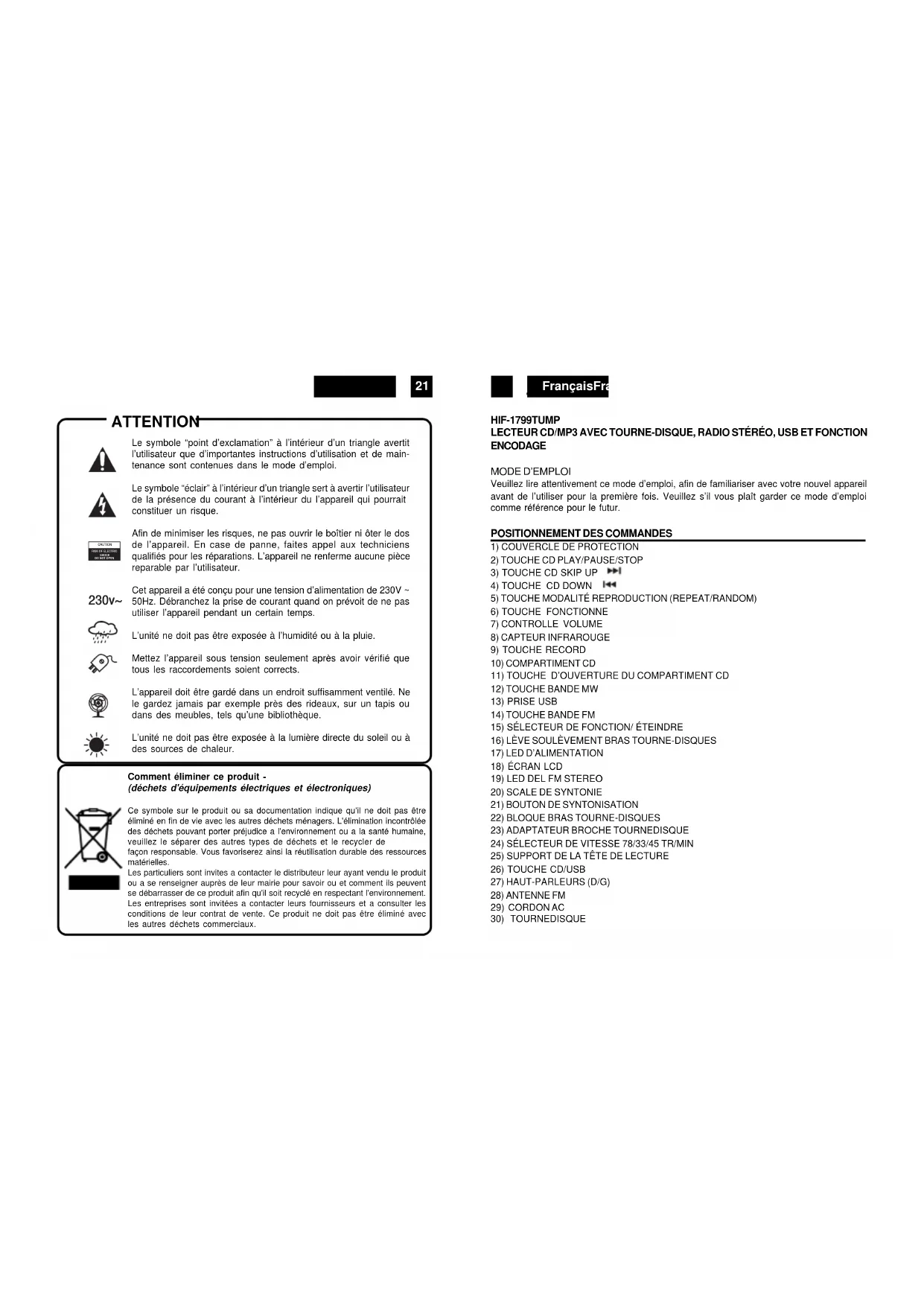 CARACTERISTIQUES TECHNIQUES Alimentation Electrique CA: 230V ~ 50Hz Telecommande: CR-2025 Fréquences Radio FM: 87,5 - 108 MHz MW: 522 - 1620 kHz Caractéristiques sujets à modifications sans avis préalable.EspañolEspañol