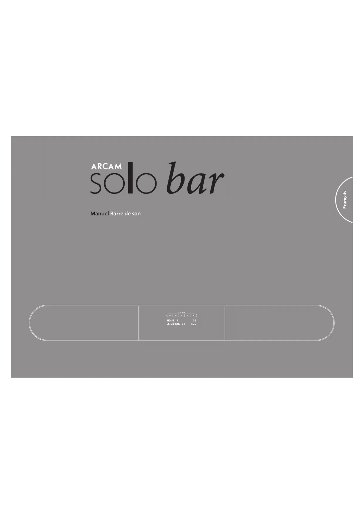 soit de Google Play™. Suivez les instructions de téléchargement qui s'ache à l'écran de votre appareil. Une fois l'installation terminée, touchez l'icône de l'application pour la lancer. application de télécommandeF-15F-14 Français HDMI 1 20 DIGITAL ST HDMI 1 20 DIGITAL ST HDMI 1 20 DIGITAL ST HDMI 1 20 DIGITAL ST Ouvrez Settings et touchez Bluetooth. Faites glisser l'interrupteur du Bluetooth sur la position on.Attendez que Arcam Solo bar apparaisse au-dessous de DEVICES puis touchez pour vous Connecter.Dans le cas où vous voudriez enlever un appareil, touchez l'icône d'information près de Connecté puis Enlever cet appareil.Remarque: Un maximum de quatre appareils Bluetooth peut être jumelé à la Solo bar, chacun étant disponible selon le principe premier arrivé-premier servi. De temps à autre, si plus d'une personne désire utiliser la Solo bar, vous pourriez avoir besoin d'enlever un appareil. fonctionnement Mise en marche Pour sortir la Solo bar du mode veille, appuyez sur la touche placée sur le panneau avant ou sur la télécommande. ARCAM Solo bar apparaît brièvement sur le panneau d'achage suivi de la source d'entrée sélectionnée, du réglage du volume et du mode audio.Remarque: Si l'appareil est inutilisé sur une longue période, débranchez-le du secteur pour économiser de l'énergie. Sélection d'une source Pour sélectionner une source particulière, appuyez sur les touches ou sur le panneau avant ou sur la télécommande jusqu'à ce que la source s'ache sur le panneau d'achage. Les sources suivantes sont disponibles: HDMI 1 HDMI 2 HDMI 3 HDMI 4 OPTICAL COAX AUX BLUETOOTH Remarque: S'ils supportent cette fonctionnalité, certains appareils HDMI s'identifieront avec leur nom d'usine.Si votre téléviseur est branché en utilisant la fonction ARC et que vous avez suivi la procédure de conguration détaillée à la page 16, le panneau d'achage montrera le message suivant lorsque vous regardez la télévision. TV/ARC Le retour audio (ARC : Audio Return Channel) est une fonctionnalité inhérente à la dernière version de HDMI qui permet à votre téléviseur de transmettre de l'audio au travers du câble vers la barre de son.Remarque: L'affichage en est automatique quand un téléviseur compatible avec ARC est branché. Contrôle du volume Ajustez le volume en appuyant sur les touches ou sur le panneau avant ou sur la télécommande. Mettre la sortie en sourdine Le son de la Solo bar peut être coupé en appuyant sur l'icône de la télécommande. Si l'appareil est mis en sourdine, le réglage du volume passe à MUTE sur le panneau d'achage.Pour annuler la mise en sourdine, appuyer sur une deuxième fois ou sur / pour changer le volume. Jumelage de votre appareil mobile L'application nécessite que votre appareil soit jumelé avec la Solo bar via Bluetooth.Assurez-vous que le Bluetooth de votre appareil est activé. Pour les appareils avec iOS, suivez ces étapes:Pour les appareils avec Android, suivez les instructions fournies avec votre appareil.F-17F-16 Français Sélection d'un mode audio La Solo bar dispose de trois modes audio précongurés - STEREO, MOVIE et CONCERT. Appuyez sur la touche de la télécommande et faites votre sélection. Remarque: Le mode par défaut est stéréo, cela signifie que l'audio est joué comme il a été enregistré. Son en provenance du téléviseur Si votre téléviseur est connecté à la Solo bar en utilisant la fonction ARC, sélectionnez la source appropriée sur votre téléviseur et protez du son superbe émis par la Solo bar en réglant le volume à l'aide de la télécommande du téléviseur. Quand elle est utilisée de cette façon, l'écran d'achage de la Solo bar montre automatiquement TV/ARC. Son en provenance d'appareil Bluetooth® Pour avoir le plaisir d'écouter de la musique sans l à partir de n'importe quel appareil Bluetooth, vous devez d'abord vous assurez que celui-ci est jumelé avec la Solo bar-reportez-vous à la page 11 pour plus d'information. Une fois que votre appareil est jumelé, il vous sut juste de suivre les instructions fournies avec votre appareil. Répéteur IR Placée devant un téléviseur, la Solo bar pourrait en bloquer (suivant le modèle) le capteur de télécommande et rendre impossible la transmission de commandes. Dans ce type de situation, utilisez la fonction de répéteur IR de la Solo bar pour relayer les signaux vers votre téléviseur. Remarque: Cela fonctionnera même quand votre Solo bar sera en mode veille. Reportez-vous à la page 18 les informations de conguration. Contrôle CEC transmis par HDMI Le contrôle «inter-éléments» (CEC: Consumer Electronics Control) est une fonctionnalité qui vous permet de brancher via HDMI jusqu'à 15 appareils compatibles et de les contrôler simultanément avec un seul boîtier de télécommande. CEC est activé par défaut. Reportez-vous à la page 20 les informations de conguration. Des exemples typiques de systèmes contrôlés par CEC incluent: < La mise en marche ou la mise en veille simultanée de chaque appareil branché. < Le contrôle de volume. < La sélection de la source d'entrée. Configuration automatique Une fonction propriétaire de conguration automatique intégrée à la Solo bar tentera de congurer les paramètres de haut-parleur essentiels pour votre système (y compris ceux d'un éventuel caisson de basse). Elle calcule également les valeurs du ltre d'égalisation de la pièce (Room EQ) pour supprimer les pires eets des fréquences de résonnance dans la pièce d'écoute. Insérez la che du microphone de calibration fourni dans la prise MIC située sur le panneau arrière et placez-le dans la zone d'écoute principale. Le microphone capte les tonalités de calibration spécialement émises par les hauts parleurs (et le caisson de basse) quand la conguration automatique s'exécute. La Solo bar analyse le signal et calcule: < le niveau d'enceinte, < la fréquence de croisement du caisson de basse, < to