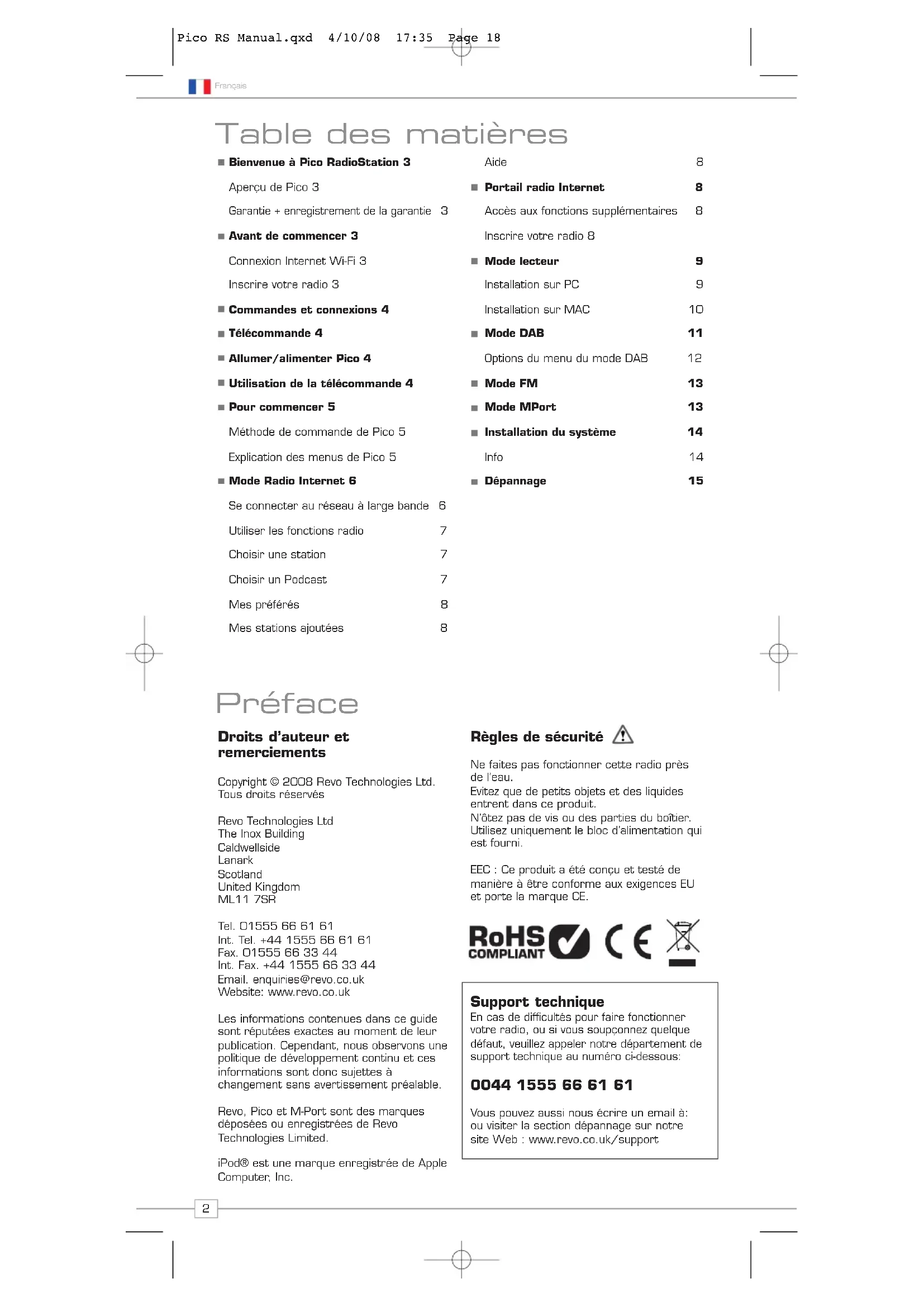 Si vous éprouvez des difficultés en utilisant votre Pico Radiostation, veillez dire le guide de dépannage ci-dessous. Vous pouvez également visiter la section support du sit Internet de Revo (www.revo.co.uk) ou appeler le personnel de support technique au 01555 66 61 61.