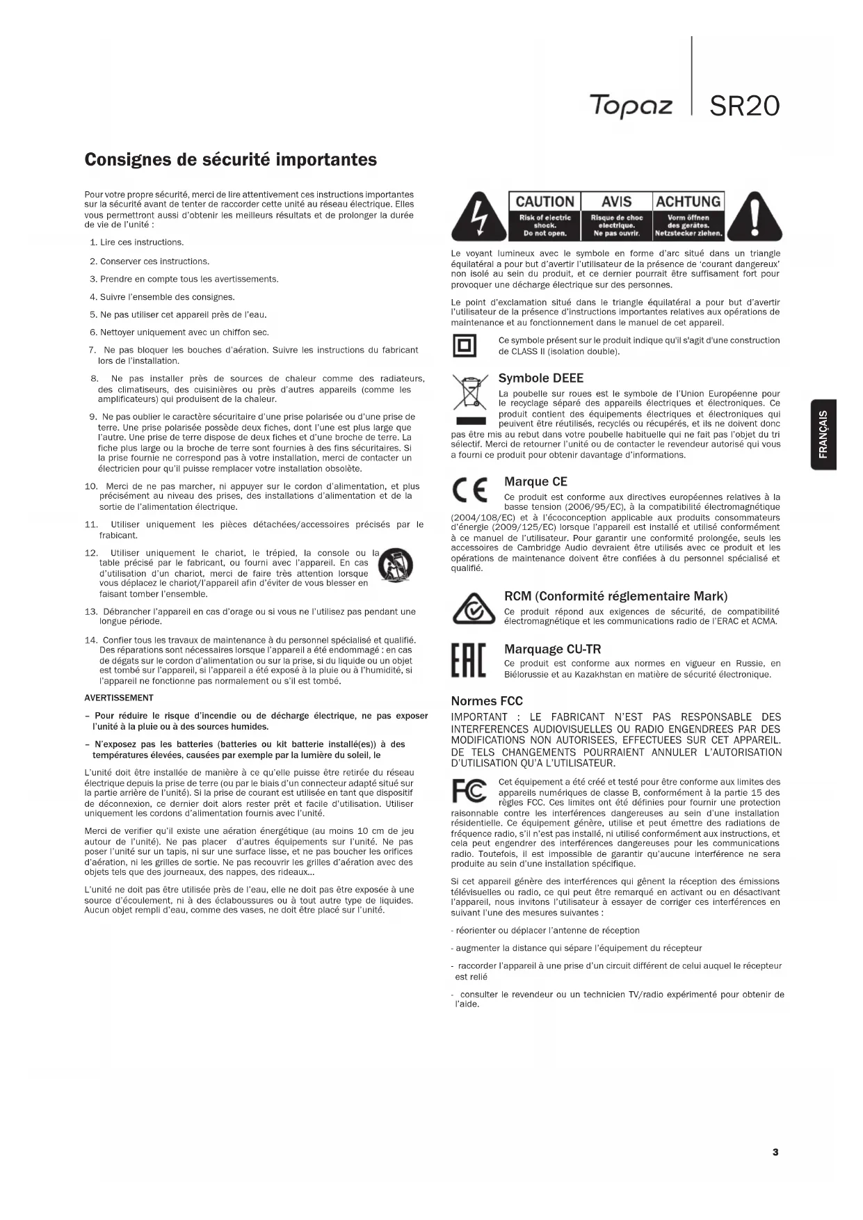 FRANÇAIS Pour votre propre sécurité, merci de lire attentivement ces instructions importantes sur la sécurité avant de tenter de raccorder cette unité au réseau électrique. Elles vous permettront aussi d’obtenir les meilleurs résultats et de prolonger la durée de vie de l’unité : 1. Lire ces instructions. 2. Conserver ces instructions. 3. Prendre en compte tous les avertissements. 4. Suivre l’ensemble des consignes. 5. Ne pas utiliser cet appareil près de l’eau. 6. Nettoyer uniquement avec un chiffon sec. 7. Ne pas bloquer les bouches d’aération. Suivre les instructions du fabricant lors de l’installation. 8. Ne pas installer près de sources de chaleur comme des radiateurs, des climatiseurs, des cuisinières ou près d’autres appareils (comme les amplificateurs) qui produisent de la chaleur. 9. Ne pas oublier le caractère sécuritaire d’une prise polarisée ou d’une prise de terre. Une prise polarisée possède deux fiches, dont l’une est plus large que l’autre. Une prise de terre dispose de deux fiches et d’une broche de terre. La fiche plus large ou la broche de terre sont fournies à des fins sécuritaires. Si la prise fournie ne correspond pas à votre installation, merci de contacter un électricien pour qu’il puisse remplacer votre installation obsolète. 10. Merci de ne pas marcher, ni appuyer sur le cordon d’alimentation, et plus précisément au niveau des prises, des installations d’alimentation et de la sortie de l’alimentation électrique. 11. Utiliser uniquement les pièces détachées/accessoires précisés par le frabicant. 12. Utiliser uniquement le chariot, le trépied, la console ou la table précisé par le fabricant, ou fourni avec l’appareil. En cas d’utilisation d’un chariot, merci de faire très attention lorsque vous déplacez le chariot/l’appareil afin d’éviter de vous blesser en faisant tomber l’ensemble.13. Débrancher l’appareil en cas d’orage ou si vous ne l’utilisez pas pendant une longue période. 14. Confier tous les travaux de maintenance à du personnel spécialisé et qualifié. Des réparations sont nécessaires lorsque l’appareil a été endommagé : en cas de dégats sur le cordon d’alimentation ou sur la prise, si du liquide ou un objet est tombé sur l’appareil, si l’appareil a été exposé à la pluie ou à l’humidité, si l’appareil ne fonctionne pas normalement ou s’il est tombé. AVERTISSEMENT– Pour réduire le risque d’incendie ou de décharge électrique, ne pas exposer l’unité à la pluie ou à des sources humides.– N’exposez pas les batteries (batteries ou kit batterie installé(es)) à des températures élevées, causées par exemple par la lumière du soleil, leL’unité doit être installée de manière à ce qu’elle puisse être retirée du réseau électrique depuis la prise de terre (ou par le biais d’un connecteur adapté situé sur la partie arrière de l’unité). Si la prise de courant est utilisée en tant que dispositif de déconnexion, ce dernier doit alors rester prêt et facile d’utilisation. Utiliser uniquement les cordons d’alimentation fournis avec l’unité.Merci de verifier qu’il existe une aération énergétique (au moins 10 cm de jeu autour de l’unité). Ne pas placer d’autres équipements sur l’unité. Ne pas poser l’unité sur un tapis, ni sur une surface lisse, et ne pas boucher les orifices d’aération, ni les grilles de sortie. Ne pas recouvrir les grilles d’aération avec des objets tels que des journeaux, des nappes, des rideaux… L’unité ne doit pas être utilisée près de l’eau, elle ne doit pas être exposée à une source d’écoulement, ni à des éclaboussures ou à tout autre type de liquides. Aucun objet rempli d’eau, comme des vases, ne doit être placé sur l’unité.Le voyant lumineux avec le symbole en forme d’arc situé dans un triangle équilatéral a pour but d’avertir l’utilisateur de la présence de ‘courant dangereux’ non isolé au sein du produit, et ce dernier pourrait être suffisament fort pour provoquer une décharge électrique sur des personnes. Le point d’exclamation situé dans le triangle équilatéral a pour but d’avertir l’utilisateur de la présence d’instructions importantes relatives aux opérations de maintenance et au fonctionnement dans le manuel de cet appareil. Ce symbole présent sur le produit indique qu'il s'agit d'une construction de CLASS II (isolation double). Symbole DEEE La poubelle sur roues est le symbole de l’Union Européenne pour le recyclage séparé des appareils électriques et électroniques. Ce produit contient des équipements électriques et électroniques qui peuivent être réutilisés, recyclés ou récupérés, et ils ne doivent donc pas être mis au rebut dans votre poubelle habituelle qui ne fait pas l’objet du tri sélectif. Merci de retourner l’unité ou de contacter le revendeur autorisé qui vous a fourni ce produit pour obtenir davantage d’informations. Marque CE Ce produit est conforme aux directives européennes relatives à la basse tension (2006/95/EC), à la compatibilité électromagnétique (2004/108/EC) et à l’écoconception applicable aux produits consommateurs d’énergie (2009/125/EC) lorsque l’appareil est installé et utilisé conformément à ce manuel de l’utilisateur. Pour garantir une conformité prolongée, seuls les accessoires de Cambridge Audio devraient être utilisés avec ce produit et les opérations de maintenance doivent être confiées à du personnel spécialisé et qualifié. RCM (Conformité réglementaire Mark) Ce produit répond aux exigences de sécurité, de compatibilité électromagnétique et les communications radio de l’ERAC et ACMA. Marquage CU-TR Ce produit est conforme aux normes en vigueur en Russie, en Biélorussie et au Kazakhstan en matière de sécurité électronique. Normes FCC IMPORTANT : LE FABRICANT N’EST PAS RESPONSABLE DES IN