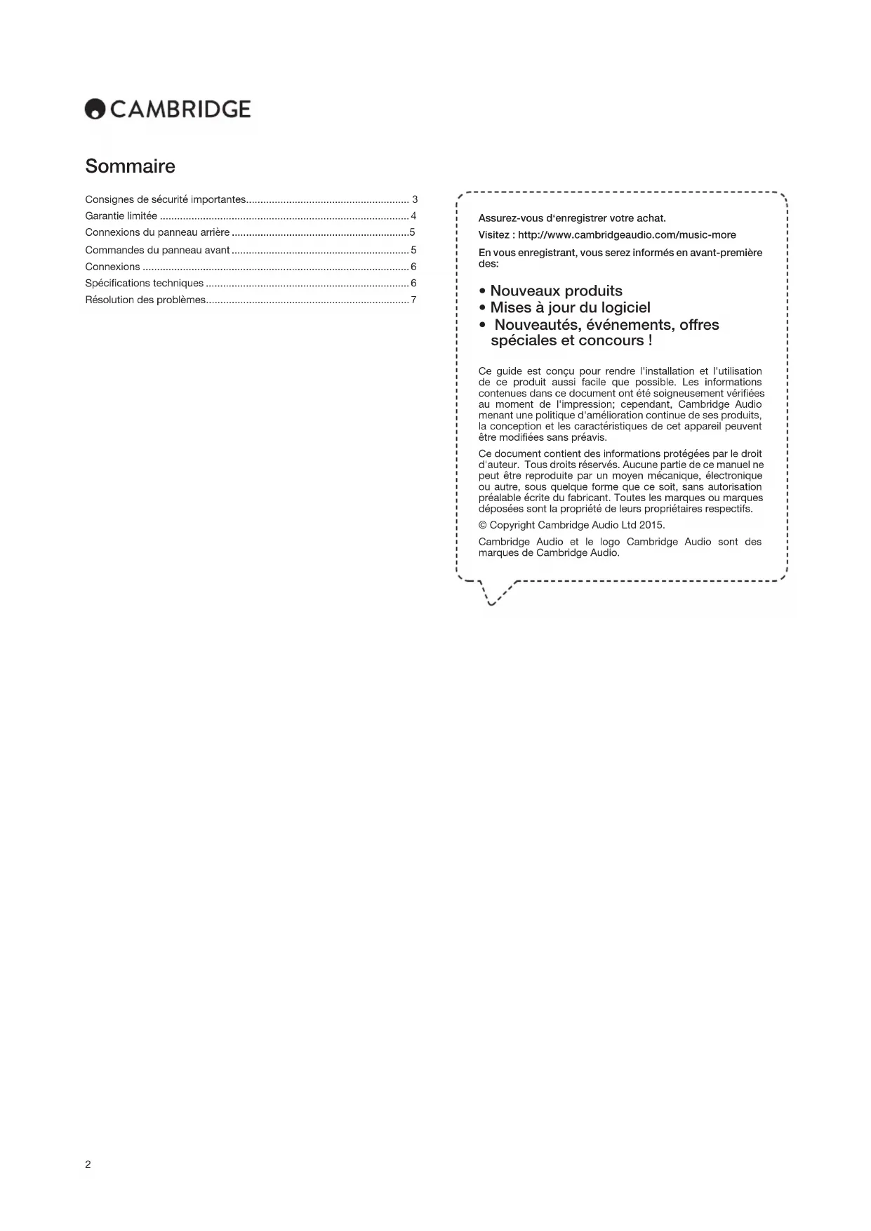 - Nouveautés, événements, ores spéciales et concours ! Ce guide est conçu pour rendre l'installation et l'utilisation de ce produit aussi facile que possible. Les informations contenues dans ce document ont été soigneusement vériées au moment de l'impression; cependant, Cambridge Audio menant une politique d'amélioration continue de ses produits, la conception et les caractéristiques de cet appareil peuvent être modiées sans préavis. Ce document contient des informations protégées par le droit d'auteur. Tous droits réservés. Aucune partie de ce manuel ne peut être reproduite par un moyen mécanique, électronique ou autre, sous quelque forme que ce soit, sans autorisation préalable écrite du fabricant. Toutes les marques ou marques déposées sont la propriété de leurs propriétaires respectifs. © Copyright Cambridge Audio Ltd 2015. Cambridge Audio et le logo Cambridge Audio sont des marques de Cambridge Audio. Consignes de sécurité importantes......................................................... 3 Garantie limitée ....................................................................................... 4 Connexions du panneau arrière ..............................................................5 Commandes du panneau avant .............................................................. 5 Connexions ............................................................................................. 6 Spécications techniques ....................................................................... 6 Résolution des problèmes .......................................................................73 CP1/CP2 Pour votre propre sécurité, merci de lire attentivement ces instructions importantes sur la sécurité avant de tenter de raccorder cette unité au réseau électrique. Elles vous permettront aussi d’obtenir les meilleurs résultats et de prolonger la durée de vie de l’appareil :