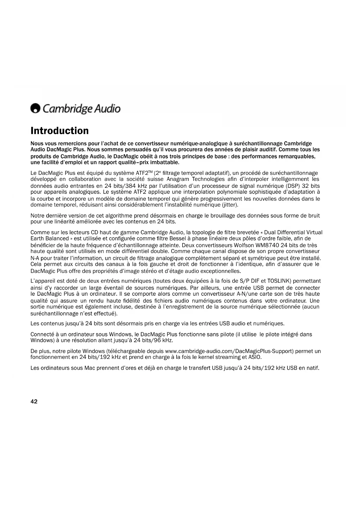 ltrage temporel adaptatif), un procédé de suréchantillonnage développé en collaboration avec la société suisse Anagram Technologies an d’interpoler intelligemment les données audio entrantes en 24 bits/384 kHz par l’utilisation d’un processeur de signal numérique (DSP) 32 bits pour appareils analogiques. Le système ATF2 applique une interpolation polynomiale sophistiquée d’adaptation à la courbe et incorpore un modèle de domaine temporel qui génère progressivement les nouvelles données dans le domaine temporel, réduisant ainsi considérablement l’instabilité numérique (jitter). Notre dernière version de cet algorithme prend désormais en charge le brouillage des données sous forme de bruit pour une linéarité améliorée avec les contenus en 24 bits. Comme sur les lecteurs CD haut de gamme Cambridge Audio, la topologie de ltre brevetée « Dual Differential Virtual Earth Balanced » est utilisée et congurée comme ltre Bessel à phase linéaire deux pôles d’ordre faible, an de bénécier de la haute fréquence d’échantillonnage atteinte. Deux convertisseurs Wolfson WM8740 24 bits de très haute qualité sont utilisés en mode différentiel double. Comme chaque canal dispose de son propre convertisseur N-A pour traiter l’information, un circuit de ltrage analogique complètement séparé et symétrique peut être installé. Cela permet aux circuits des canaux à la fois gauche et droit de fonctionner à l’identique, an d’assurer que le DacMagic Plus offre des propriétés d’image stéréo et d’étage audio exceptionnelles. L’appareil est doté de deux entrées numériques (toutes deux équipées à la fois de S/P DIF et TOSLINK) permettant ainsi d’y raccorder un large éventail de sources numériques. Par ailleurs, une entrée USB permet de connecter le DacMagic Plus à un ordinateur. Il se comporte alors comme un convertisseur A-N/une carte son de très haute qualité qui assure un rendu haute délité des chiers audio numériques contenus dans votre ordinateur. Une sortie numérique est également incluse, destinée à l’enregistrement de la source numérique sélectionnée (aucun suréchantillonnage n’est effectué). Les contenus jusqu’à 24 bits sont désormais pris en charge via les entrées USB audio et numériques. Connecté à un ordinateur sous Windows, le DacMagic Plus fonctionne sans pilote (il utilise le pilote intégré dans Windows) à une résolution allant jusqu’à 24 bits/96 kHz. De plus, notre pilote Windows (téléchargeable depuis www.cambridge-audio.com/DacMagicPlus-Support) permet un fonctionnement en 24 bits/192 kHz et prend en charge à la fois le kernel streaming et ASIO. Les ordinateurs sous Mac prennent d’ores et déjà en charge le transfert USB jusqu’à 24 bits/192 kHz USB en natif.43 azur DacMagic Plus FRANÇAIS Une sortie casque de haute qualité permet une écoute individuelle et une option de mode préampli numérique permet d’utiliser le DacMagic Plus directement dans un amplicateur de puissance ou des enceintes actives si on le souhaite. Votre DacMagic Plus ne peut faire preuve de ses qualités que s’il est raccordé à un système de qualité équivalente. Il est primordial de ne pas transiger sur la qualité de votre amplicateur, des enceintes ou du câblage. Naturellement, nous recommandons particulièrement les systèmes d’amplication de la gamme Cambridge Audio. Votre revendeur peut également vous fournir des câbles d’interconnexion Cambridge Audio d’excellente qualité qui permettront à votre système d’atteindre son véritable potentiel. Nous vous remercions de prendre le temps de lire ce manuel et vous recommandons de le conserver an de pouvoir vous y reporter ultérieurement. Matthew Bramble Directeur Technique de Cambridge Audio et l’équipe de création du DacMagic Plus44 Consignes de sécurité importantes Pour votre propre sécurité, merci de lire attentivement ces consignes importantes sur la sécurité avant de tenter de raccorder cet appareil au réseau électrique. Elles vous permettront aussi d’obtenir les meilleurs résultats et de prolonger la durée de vie de l’appareil :