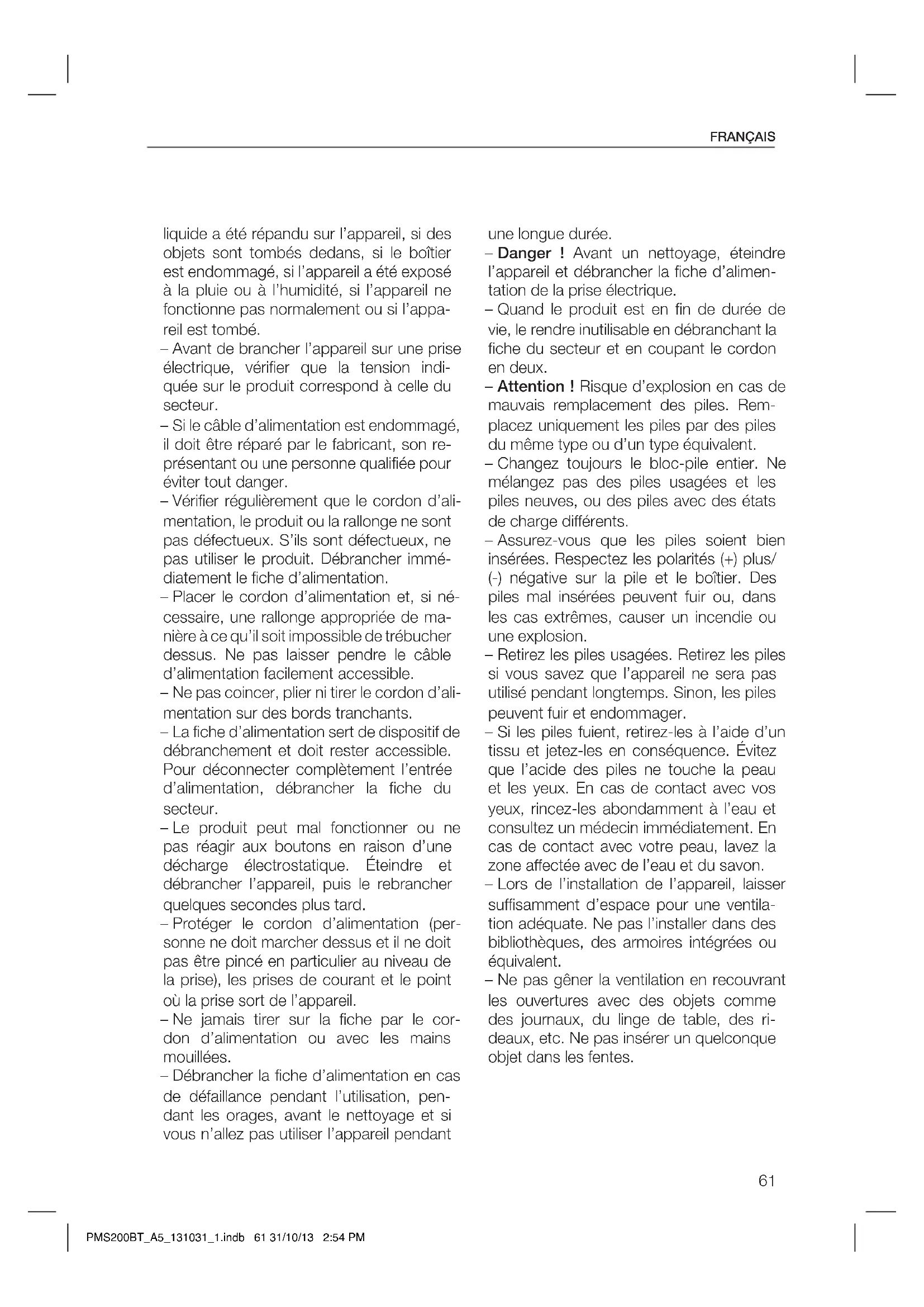 2.4-2.483 GHz Clase 2 Entrada AUX 2 x 10W RMS Plano/Clásica/Rock/Pop/Jazz Plano/Clásica/Rock/Pop/Jazz 250-280 mV a 32 OHM (1K 0dB) aprox. 220 x 244 x 118 mm aprox. 138 x 200 x 226 mm aprox. 5,54 kg NOTA: Los archivos WMA protegidos por DRM no están soportados por este producto. Especificaciones PMS200BT_A5_131031_1.indb 59 31/10/13 2:54 PM61 FRANÇAIS liquide a été répandu sur l’appareil, si des objets sont tombés dedans, si le boîtier est endommagé, si l’appareil a été exposé à la pluie ou à l’humidité, si l’appareil ne fonctionne pas normalement ou si l’appa- reil est tombé. – Avant de brancher l’appareil sur une prise électrique, vérifier que la tension indi- quée sur le produit correspond à celle du secteur. – Si le câble d’alimentation est endommagé, il doit être réparé par le fabricant, son re- présentant ou une personne qualifiée pour éviter tout danger. – Vérifier régulièrement que le cordon d’ali- mentation, le produit ou la rallonge ne sont pas défectueux. S’ils sont défectueux, ne pas utiliser le produit. Débrancher immé- diatement le fiche d’alimentation. – Placer le cordon d’alimentation et, si né- cessaire, une rallonge appropriée de ma- nière à ce qu’il soit impossible de trébucher dessus. Ne pas laisser pendre le câble d’alimentation facilement accessible. – Ne pas coincer, plier ni tirer le cordon d’ali- mentation sur des bords tranchants. – La fiche d’alimentation sert de dispositif de débranchement et doit rester accessible. Pour déconnecter complètement l’entrée d’alimentation, débrancher la fiche du secteur. – Le produit peut mal fonctionner ou ne pas réagir aux boutons en raison d’une décharge électrostatique. Éteindre et débrancher l’appareil, puis le rebrancher quelques secondes plus tard. – Protéger le cordon d’alimentation (per- sonne ne doit marcher dessus et il ne doit pas être pincé en particulier au niveau de la prise), les prises de courant et le point où la prise sort de l’appareil. – Ne jamais tirer sur la fiche par le cor- don d’alimentation ou avec les mains mouillées. – Débrancher la fiche d’alimentation en cas de défaillance pendant l’utilisation, pen- dant les orages, avant le nettoyage et si vous n’allez pas utiliser l’appareil pendant une longue durée. – Danger ! Avant un nettoyage, éteindre l’appareil et débrancher la fiche d’alimen- tation de la prise électrique. – Quand le produit est en fin de durée de vie, le rendre inutilisable en débranchant la fiche du secteur et en coupant le cordon en deux. – Attention ! Risque d’explosion en cas de mauvais remplacement des piles. Rem- placez uniquement les piles par des piles du même type ou d’un type équivalent. – Changez toujours le bloc-pile entier. Ne mélangez pas des piles usagées et les piles neuves, ou des piles avec des états de charge diérents. – Assurez-vous que les piles soient bien insérées. Respectez les polarités (+) plus/ (-) négative sur la pile et le boîtier. Des piles mal insérées peuvent fuir ou, dans les cas extrêmes, causer un incendie ou une explosion. – Retirez les piles usagées. Retirez les piles si vous savez que l’appareil ne sera pas utilisé pendant longtemps. Sinon, les piles peuvent fuir et endommager. – Si les piles fuient, retirez-les à l’aide d’un tissu et jetez-les en conséquence. Évitez que l’acide des piles ne touche la peau et les yeux. En cas de contact avec vos yeux, rincez-les abondamment à l’eau et consultez un médecin immédiatement. En cas de contact avec votre peau, lavez la zone aectée avec de l’eau et du savon. – Lors de l’installation de l’appareil, laisser susamment d’espace pour une ventila- tion adéquate. Ne pas l’installer dans des bibliothèques, des armoires intégrées ou équivalent. – Ne pas gêner la ventilation en recouvrant les ouvertures avec des objets comme des journaux, du linge de table, des ri- deaux, etc. Ne pas insérer un quelconque objet dans les fentes. PMS200BT_A5_131031_1.indb 61 31/10/13 2:54 PMFRANÇAIS