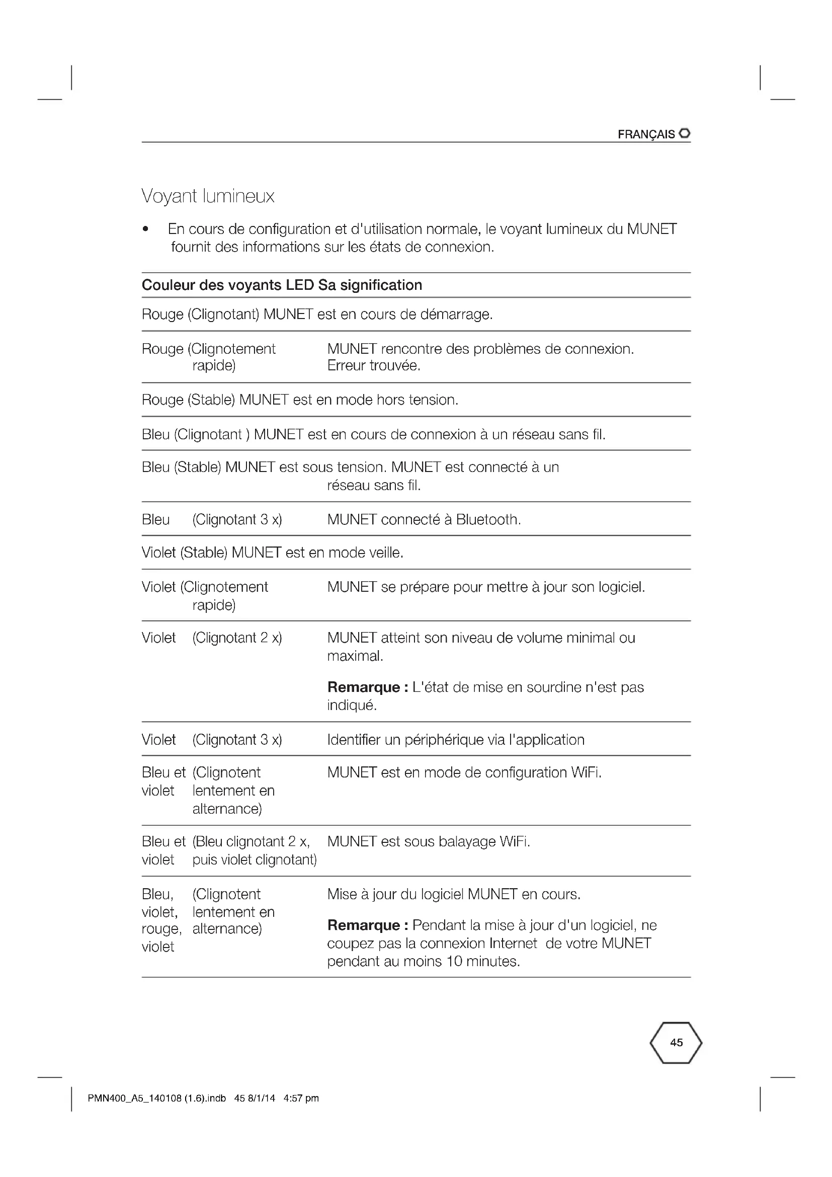 - En cours de configuration et d'utilisation normale, le voyant lumineux du MUNET fournit des informations sur les états de connexion. Couleur des voyants LED Sa signification Rouge (Clignotant) MUNET est en cours de démarrage. Rouge (Clignotement rapide) MUNET rencontre des problèmes de connexion. Erreur trouvée. Rouge (Stable) MUNET est en mode hors tension. Bleu (Clignotant) MUNET est en cours de connexion à un réseau sans fil. Bleu (Stable) MUNET est sous tension. MUNET est connecté à un réseau sans fil. Bleu (Clignotant 3 x) MUNET connecté à Bluetooth. Violet (Stable) MUNET est en mode veille. Violet (Clignotement rapide) MUNET se prépare pour mettre à jour son logiciel. Violet (Clignotant 2 x) MUNET atteint son niveau de volume minimal ou maximal. Remarque : L'état de mise en sourdine n'est pas indiqué. Violet (Clignotant 3 x) Identifier un périphérique via l'application Bleu et violet (Clignotent lentement en alternance) MUNET est en mode de configuration WiFi. Bleu et violet (Bleu clignotant 2 x, puis violet clignotant) MUNET est sous balayage WiFi. Bleu, violet, rouge, violet (Clignotent lentement en alternance) Mise à jour du logiciel MUNET en cours. Remarque : Pendant la mise à jour d'un logiciel, ne coupez pas la connexion Internet de votre MUNET pendant au moins 10 minutes. PMN400_A5_140108 (1.6).indb 45 8/1/14 4:57 pmFRANÇAIS